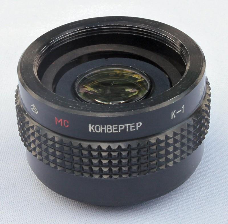 The MC K-1 is a 2x coverter. It was made for M42 lenses and has a pin for auto-diaphragm mechanisms. It was manufactured by the Arsenal factory in Kiev.