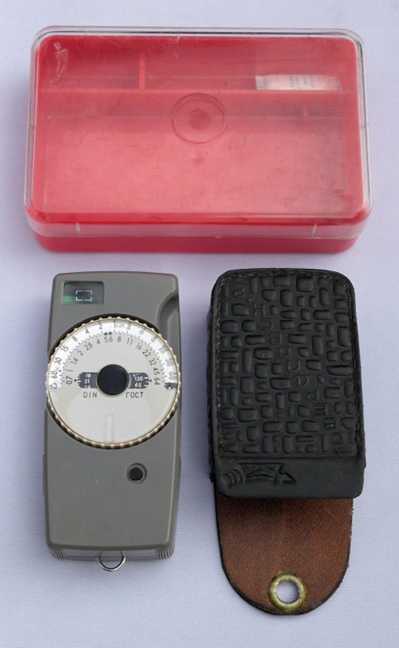 The first two photos show the first version of the Sverdolvsk-2 exposure meter. The second version in photos 3 & 4 has the addition of a battery check button on the front of the meter. The Svedlovsk-2 has a viewfinder to align the meter with the subject and a red LED to indicate the correct exposure settings. Film speeds in the range 1 to 2000 GOST (3 to 36 DIN) can be set and exposures from 30 minutes to 1/4000 second can be calculated. The meter uses 3 x 625 button cells. Manufactured in the 1970s.