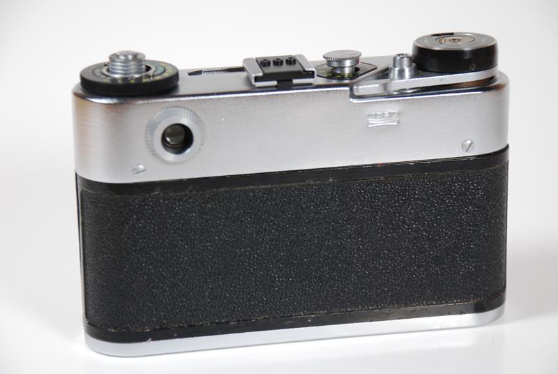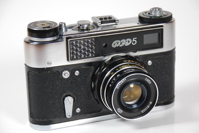 This camera was a cosmetic redesign of the FED-4. Although there was very little change to the overall camera it looks much better than its' predecessor. The meter is very well integrated into the top deck with the rewind knob now in the center of the meter dial. The camera also has a hot shoe as well as a flash jack. The few variations existing, the export model and the 1980 Moscow Games.