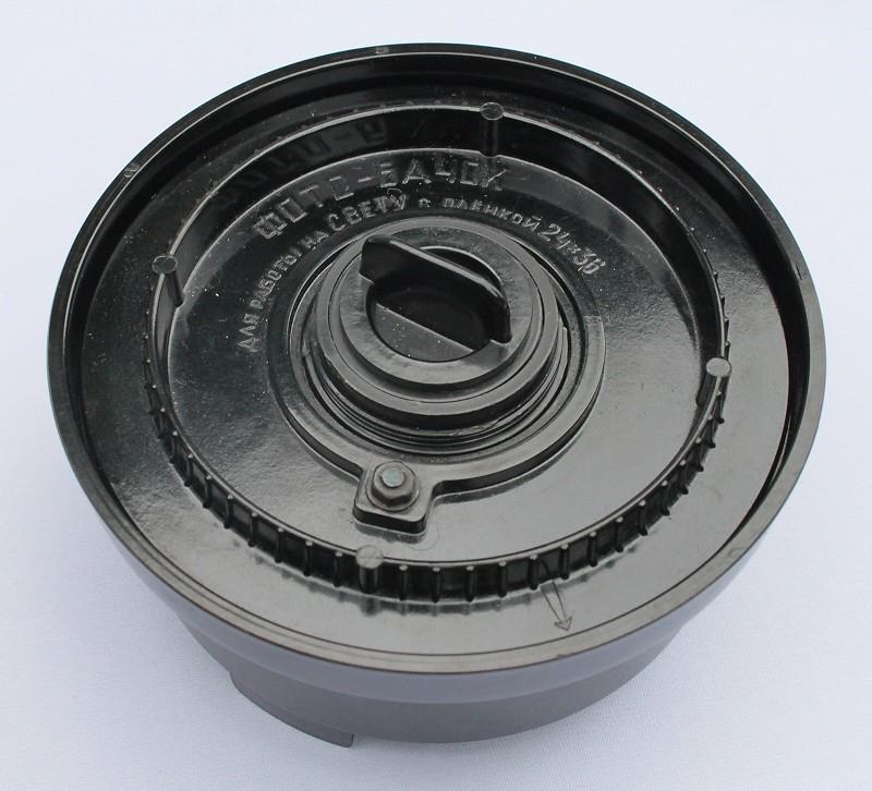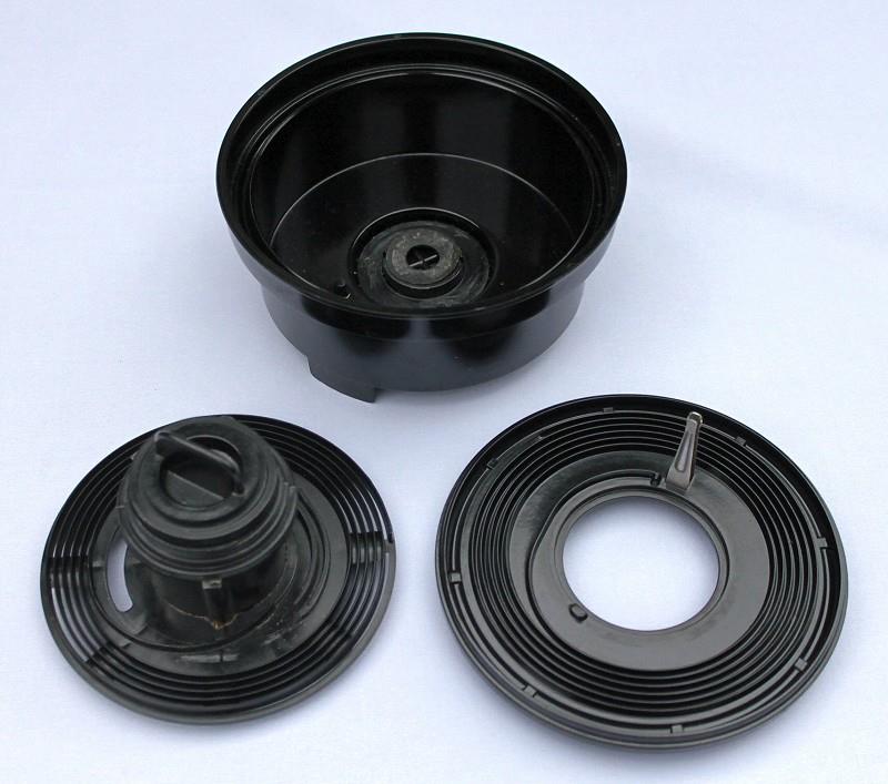 This is a bakelite daylight loading developing tank for 35 mm film. The cassette of film is placed in the central compartment andc the end of the film is fixed into the stainless steel clip that can be seen in the second photograph. Moving the top cover backwards and forwards advances the film into the spiral. Manufactured by KPZ.