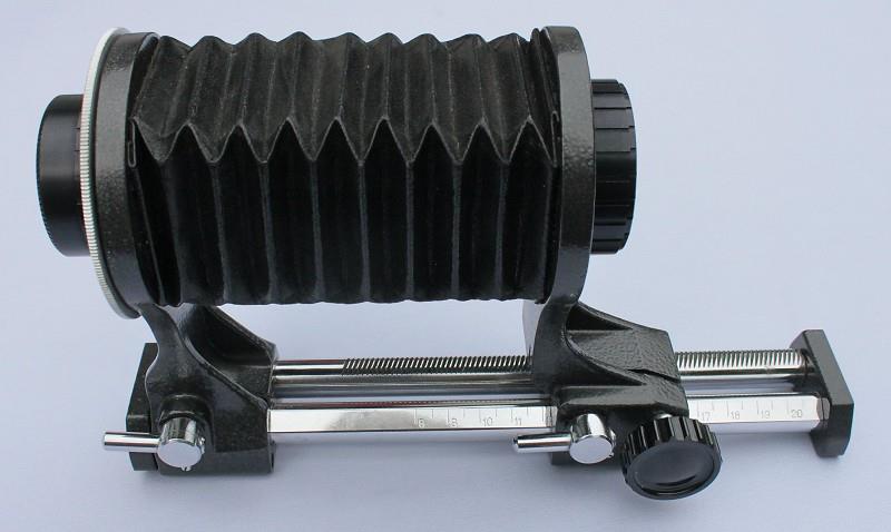 These bellows for macrophotography were made by MMZ in Minsk. The camera and lens fittings are for M39 screw mounts.