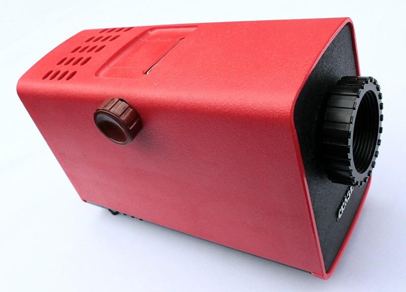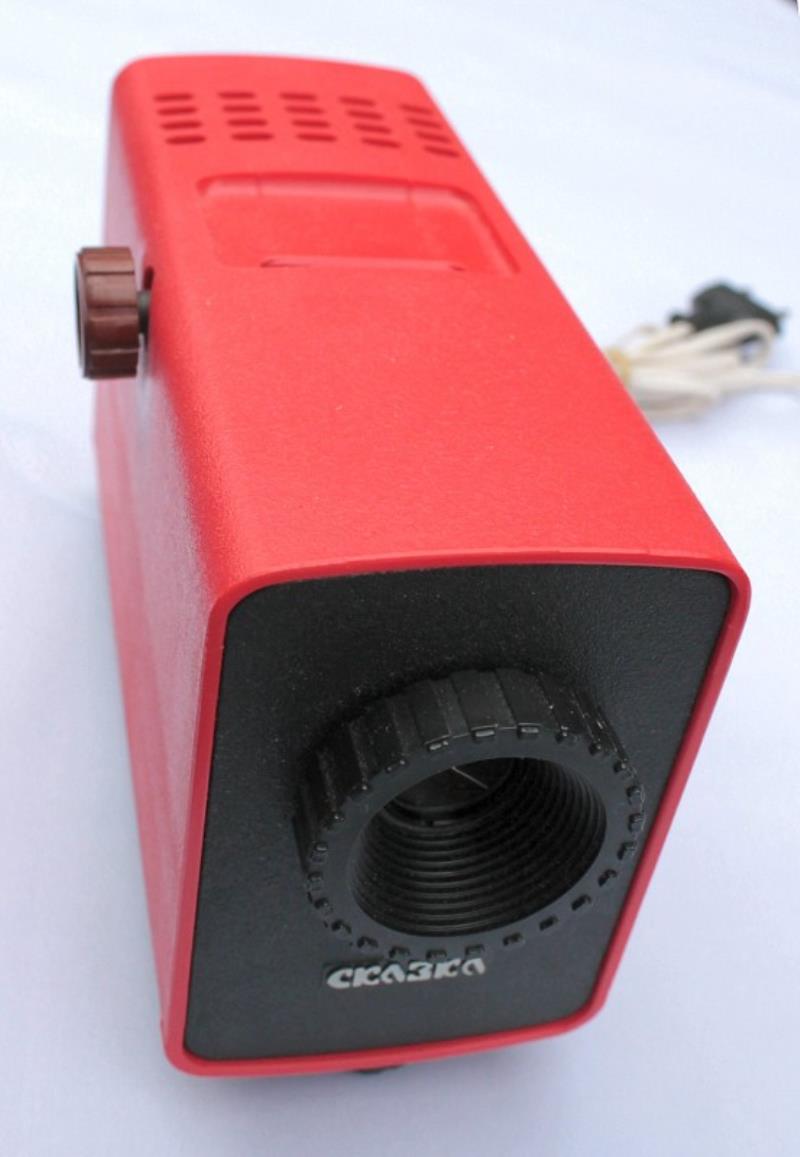 The Skazka is a 35 mm film strip projector. Probably manufactured in the 1970s. The design of the film-path is unusual, as the film strip is loaded into the top and exits right at the bottom at the back of the projector. It uses 6 volt, 30 watt lamps.