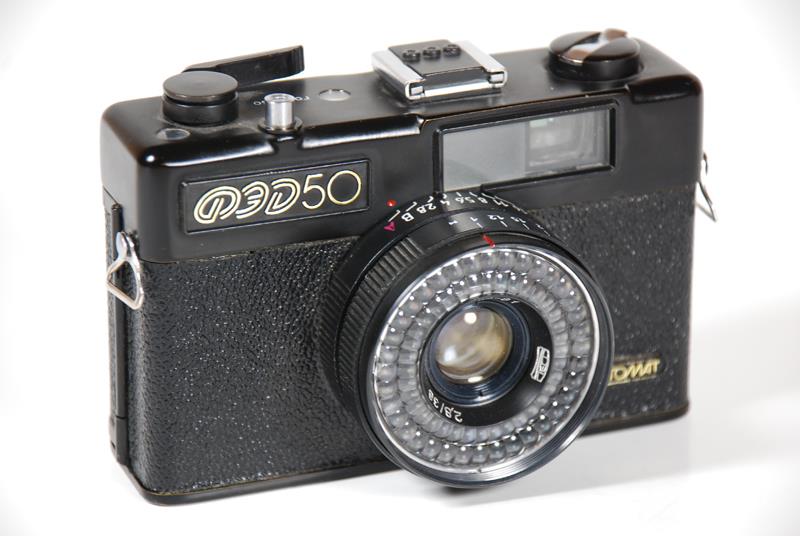 FED-50 is a viewfinder camera with manual override. The FED-50 camera is finished all in black with gold lettering. Focusing is by distance scale on the lens or symbols in the viewfinder. Shutter speeds are visible in the viewfinder as is a parallax frame for close-ups. The back is hinged. FED-50 camera has a soft black or beige vinyl zippered case.