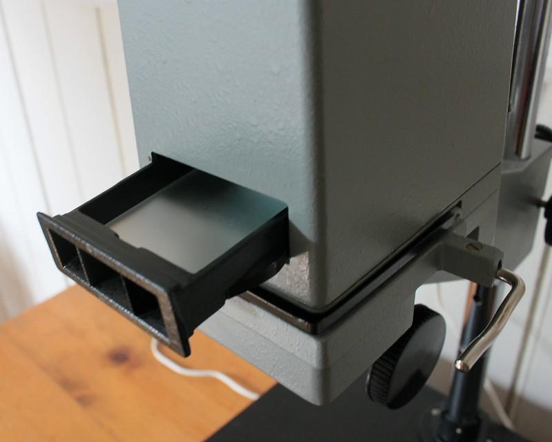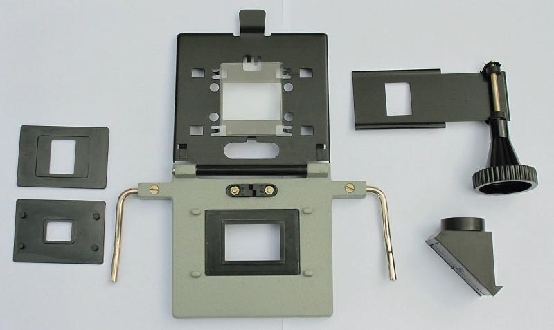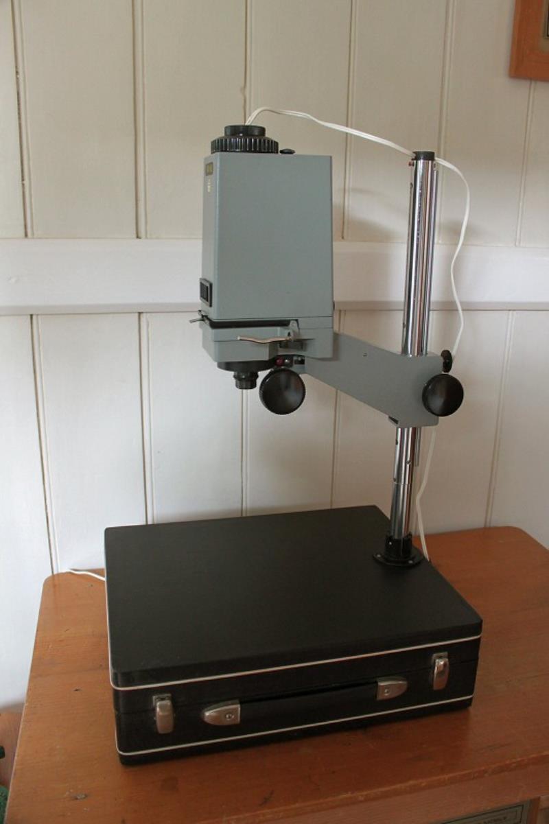 The UPA-601 enlarger is portable and uses its own carrying case as a baseboard. It is a 35 mm full frame enlarger and has masks (photo 5) for half-frame and 13 x 17 mm. It also has a 45 degree mirror attachment so that the image can be projected onto a wall. The lens (photo 4) is an Industar-50Y f/3.5 50 mm. It uses a 60 watt lamp. There is a filter drawer (photo 3) for colour correction.Autofocus is available in the 2.5x to 8x magnification range. Above 8x upto 20x the focus is manual. A small safelight (photo 6) is also included in the kit.
