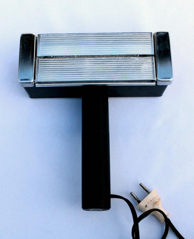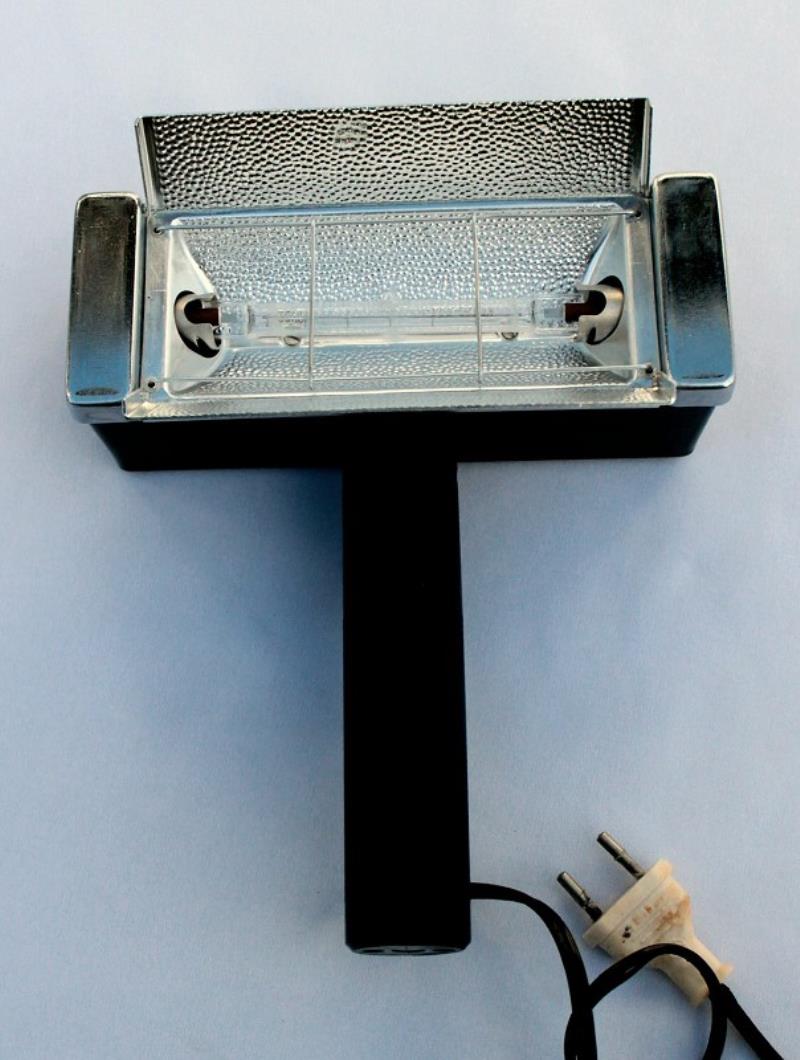 The Foton Cine Light uses a single quartz halogen tube, type KG 220-500-1. The horizontal top and bottom reflectors close to protect the lamp. There is a single on/off switch on the back of the handle. The Foton uses 220 volt main electricity and the lamp is 500 watts.