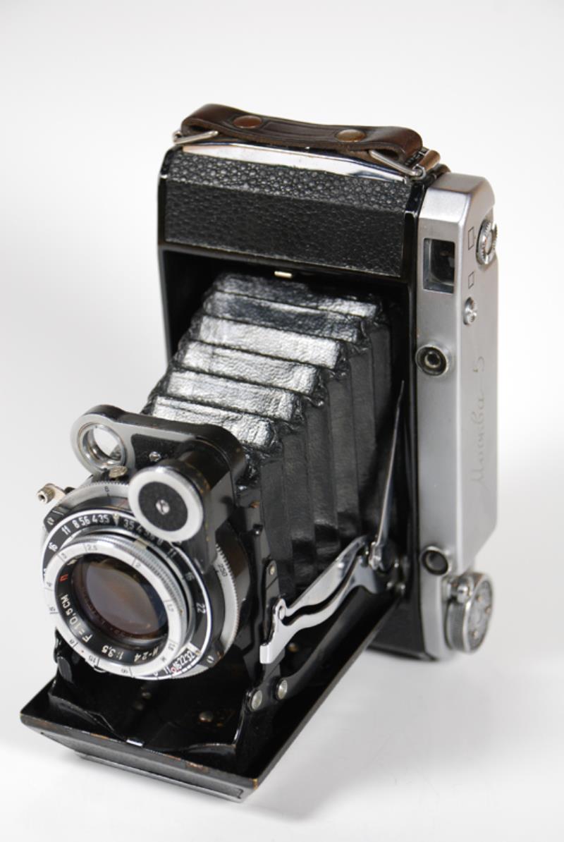 The only apparent changes in this camera are the engraving, the lens and the shutter. This camera was produced from 1956 to 1960. The case for this camera is made of brown plastic or leather marked Moscow 5. Interestingly enough some of these cameras have lenses that are not threaded for filters [2].