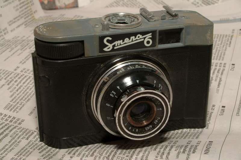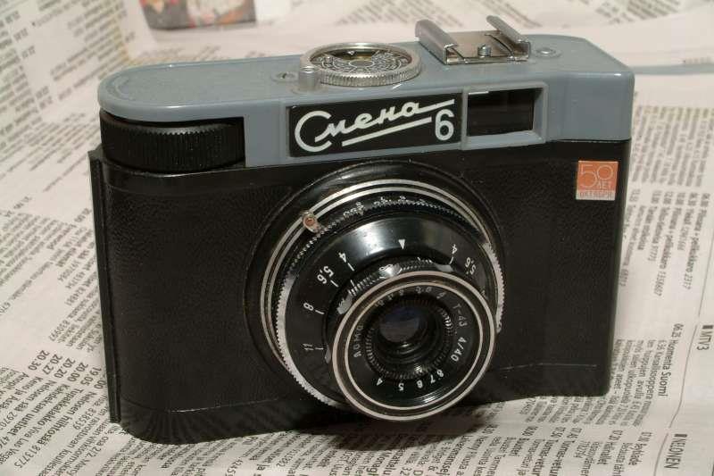 Camera identical to Smena-5 with synchronized flash and selftimer. Lens coated „T-43“, additional shutter speed 1/15. No more strap lugs. On early models body still can see the signs of strap lugs. In the back of camera imprinted either old GOMZ logo, either blank circle.