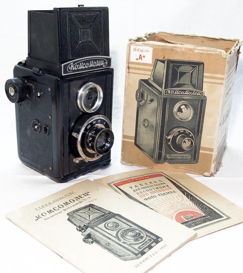 Camera photo in original packaging from the collection of Vladimir Danilov- Eckert. T Camera pictured with the original packaging has a later shutter version and the box is from a different model - Komsomolets Model A.