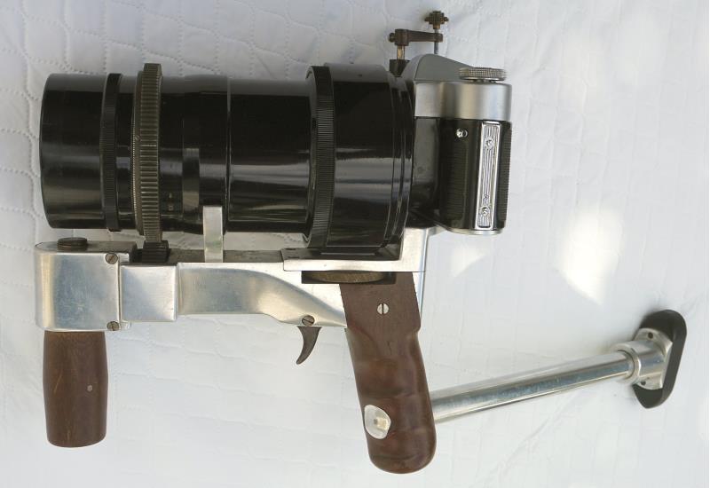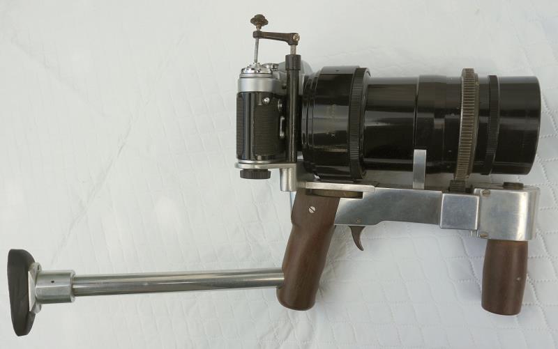 This appears to be a very well produced homemade item. It is based on a Zenit-3M with an MTO 500mm lens. The handle at the front, under the lens hood, rotates in order to focus the lens. It also offers greater stability and excellent balance, as the combined weight is over 3 kilos. Probably made in the mid to late 1960s.