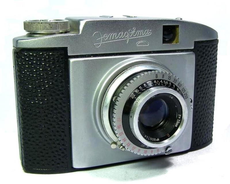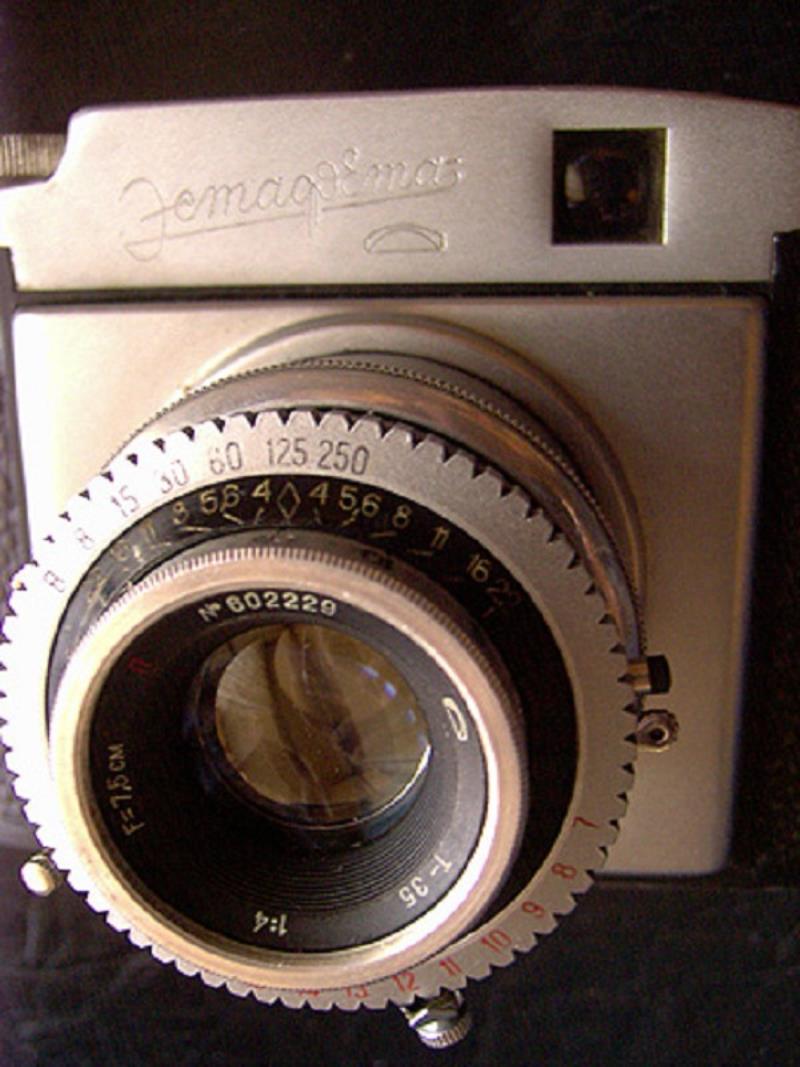 The Estafeta is a 6x6 medium format camera, it uses standard 120 film. The camera has a rigid metal body and a collapsible lens/shutter. It pops out loudly when the lock button is pressed (located on the top cover).