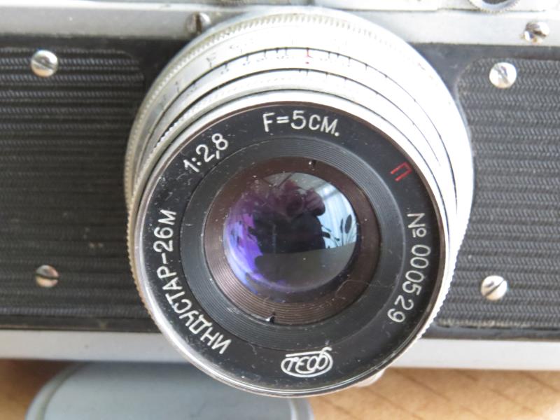 This camera was equipped with a very early Industar 26M with big ciphers (certainly not original) when bought.