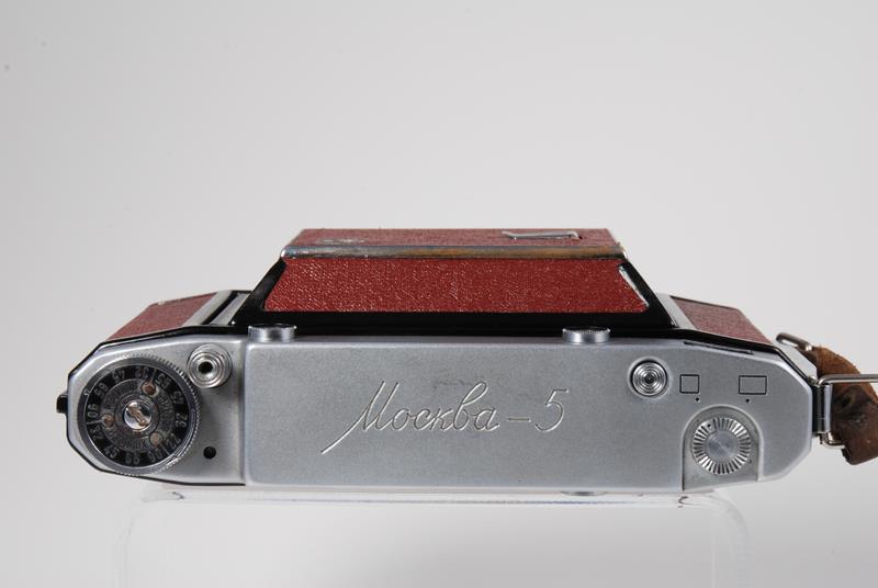 The only apparent changes in this camera from Moskva 4 are the engraving, the lens and the shutter. This camera was produced from 1956 to 1960. The case for this camera is made of brown plastic or leather marked Moscow 5. Interestingly enough some of these cameras have lenses that are not threaded for filters .