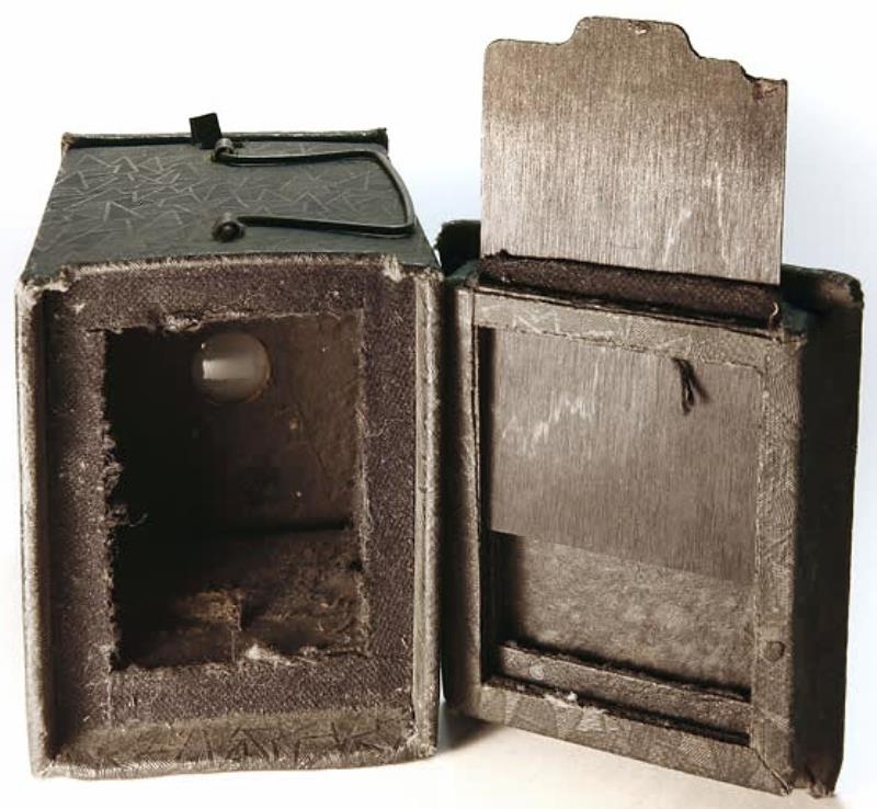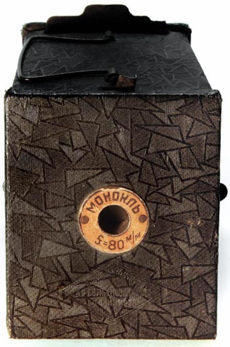 Simple box camera, made for use with 4.5x6cm plates in standard cartridges. The body is made out of cardboard and is expandable, consisting of 2 halfs for focusing on matte glass.