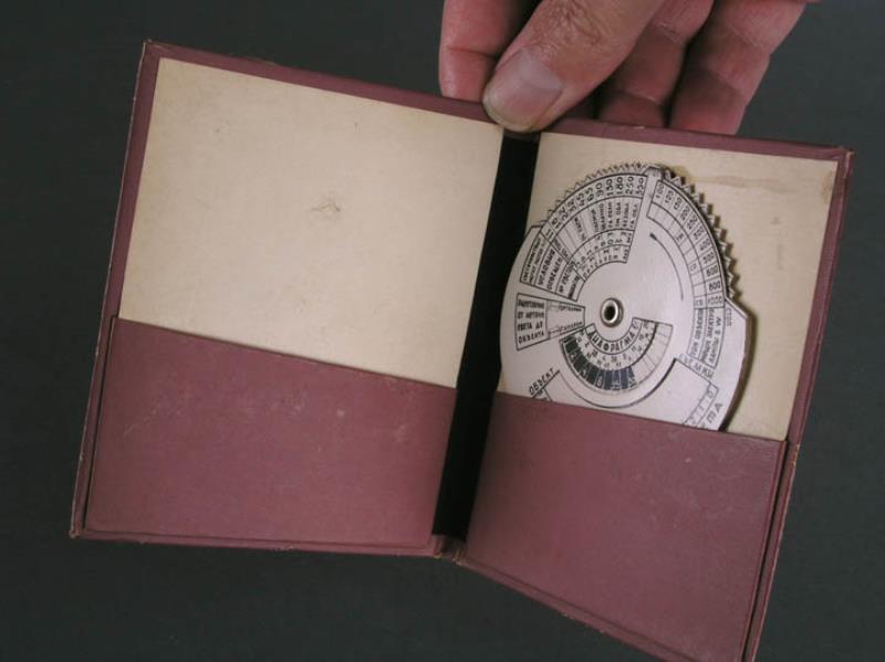 The back is impressed with Cyrillic writing relating to the original price of the booklet. Inside, in a pocket, resides a round adjustable exposure calculating device whose wheels are actual photographs, contact printed onto silver-gelatin emulsion coated photographic paper. There may have also been a paper table in the opposite inside pocket, now missing. The booklet is hand-made and although very popular and numerous at the time they were used, few have survived, having been discarded after the widespread use of selenium and electronic mechanical light meters.
