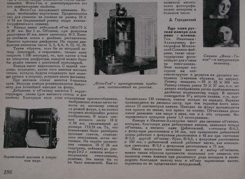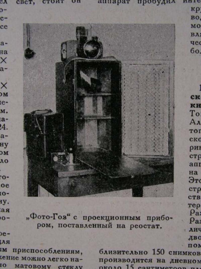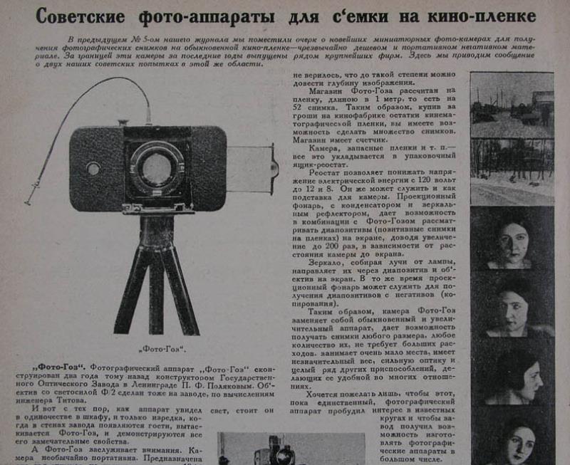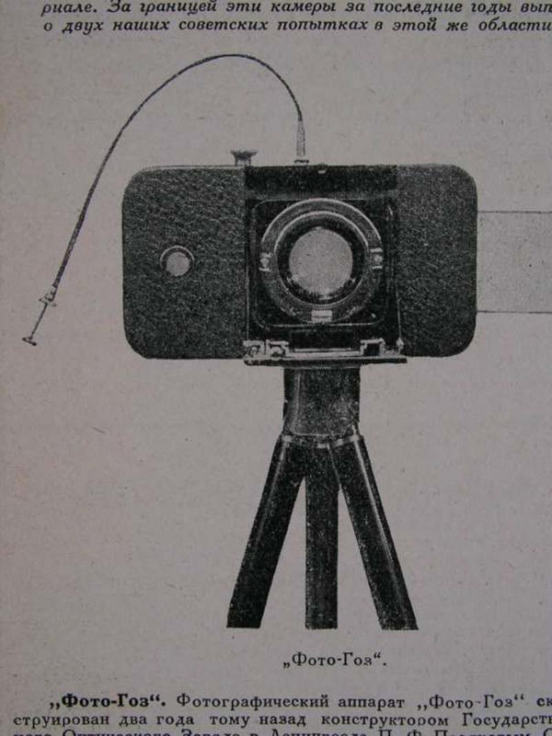 This article about the Foto-Goz, the first Soviet camera constructed in a state factory and the first Soviet camera to use perforated 35mm film, was published in the a 1927 issue of Soviet Photo magazine (No. 6). Here are photos of the covers of the magazine, the article about the Foto-Goz, and some other interesting pages from this issue. Notice an advertisement from EFTE and some beautiful gravure photographs of a Siberian expedition. There are no known examples of Foto-Goz in collections, as far as I know. This magazine is in my collection.