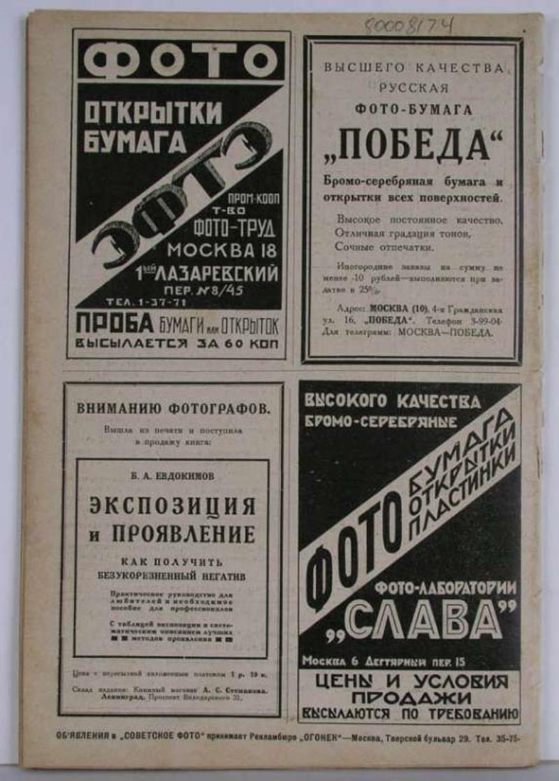 Many of the earlier issues of Sovetskoe Foto and Proletarskoe Foto magazines are illustrated with actual high-quality gravure prints of Russian photography, however the quality of the paper is unfortunately low (newsprint). Later issues used offset printing.