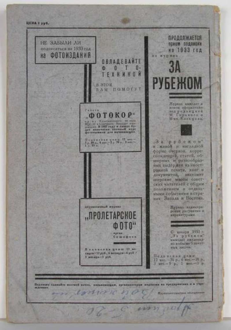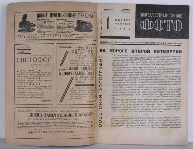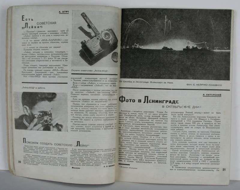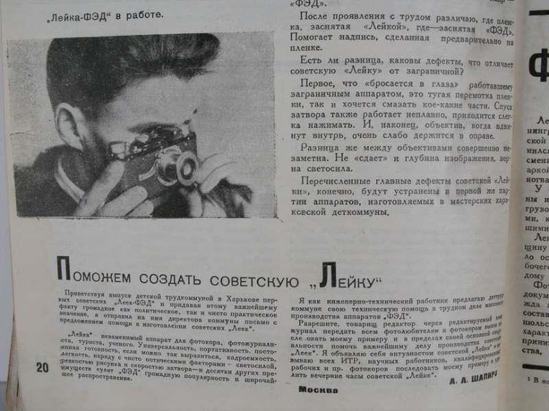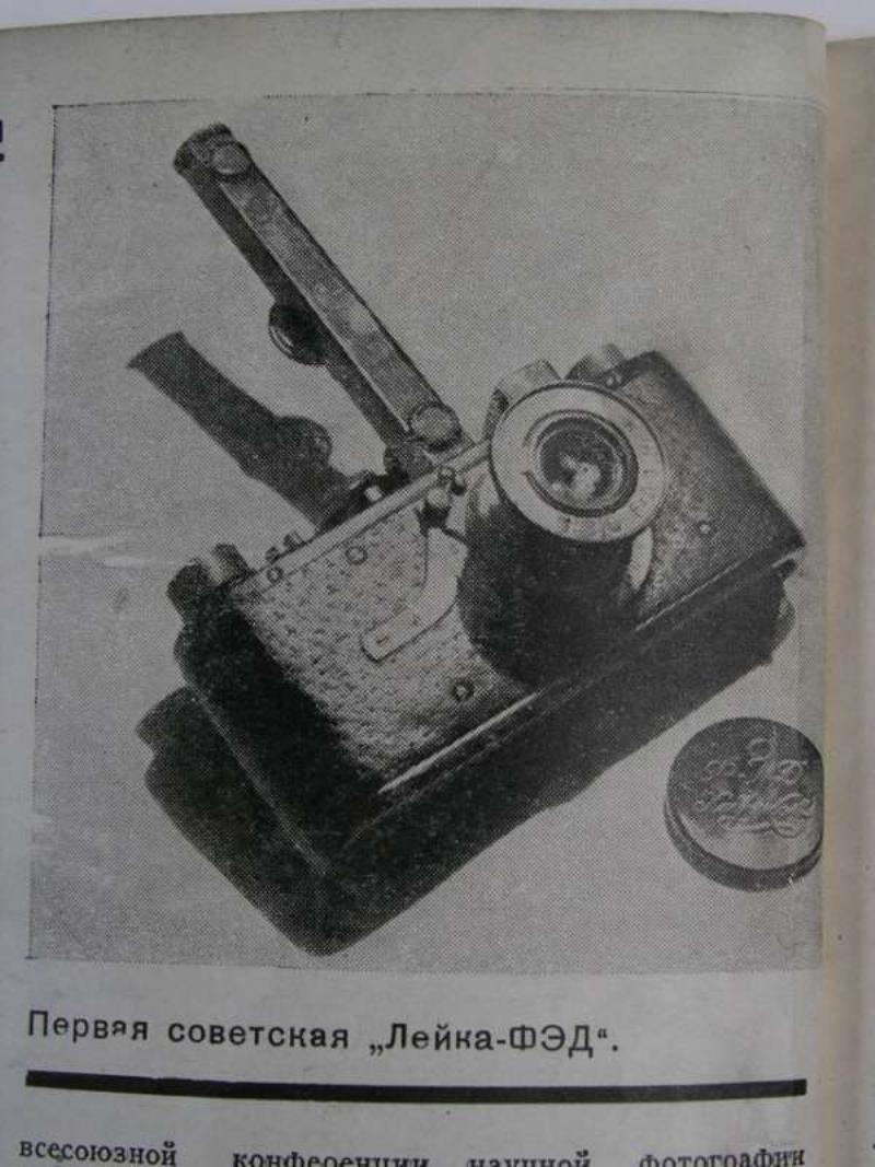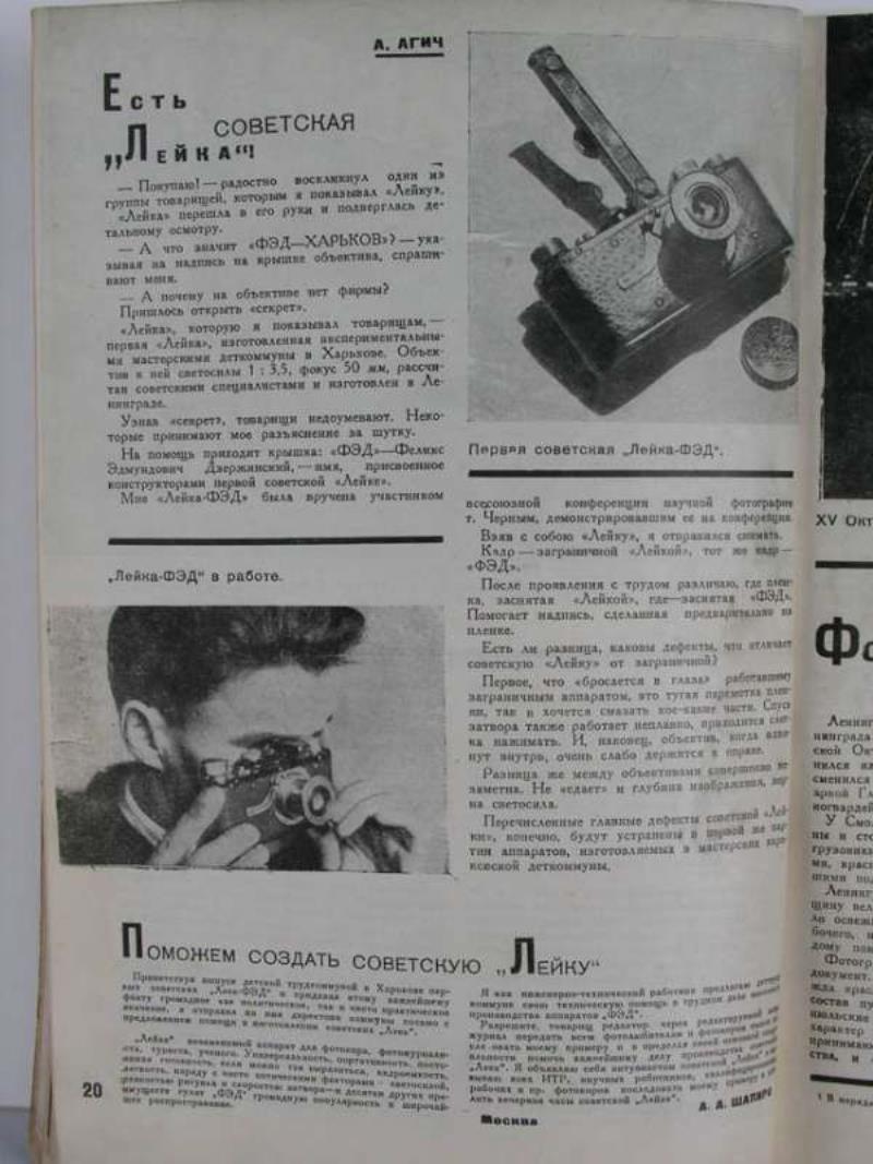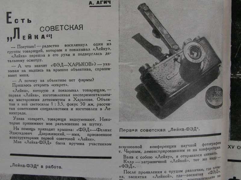 The announcement of the original "Russian Leica", the first FED 35mm camera, was made in January 1933 in issue #1 of Proletarian Photo magazine. Here are photos of the covers of the magazine, the article announcing the FED, and some other interesting pages of this historic issue. Only about 30 of these cameras were made by the F.E. Dzerjinski Communards, and so far as we know, none are known to exist in collections. This magazine is in my collection.