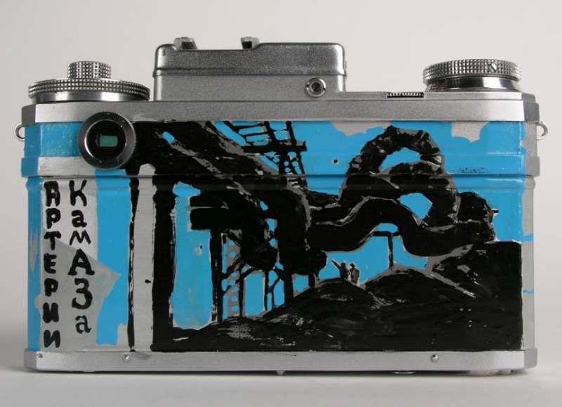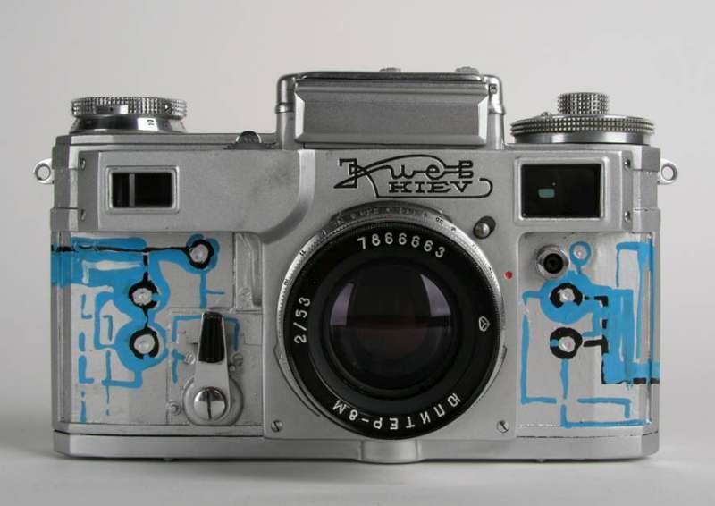 An unusual and unique Kiev 4 that has no covering and has had the body painted with a Russian Modernist - Constructivist scene by an unknown Ukrainian artist. The camera dates from 1973 but the artwork was done in 2005 or 2006.