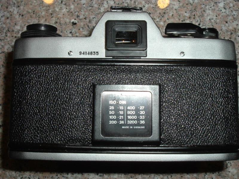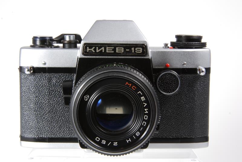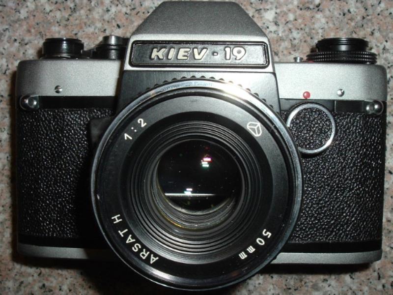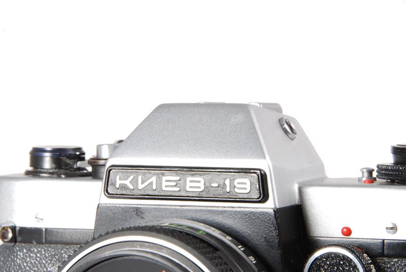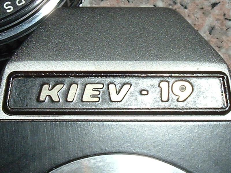 After Ukraine separated from Russia (1992?) camera was fitted with lens Arsat H - relabeled Helios 81? and it has Latin letters on the front and Made in Ukraine on the back. It was succeeded by Kiev 19M mostly made from plastic.