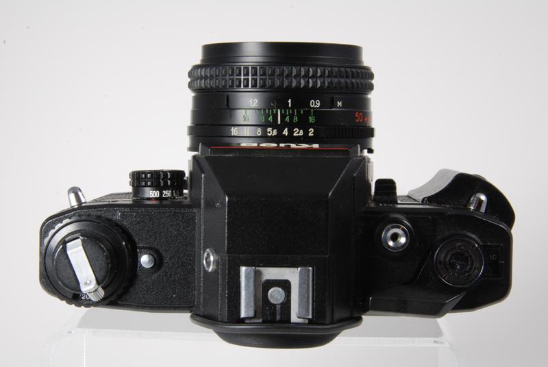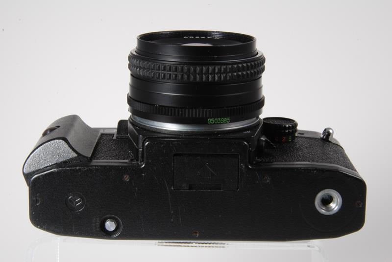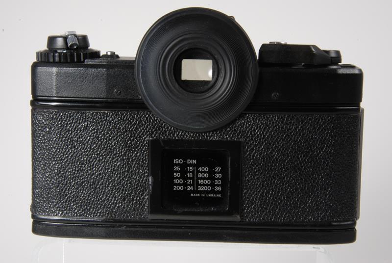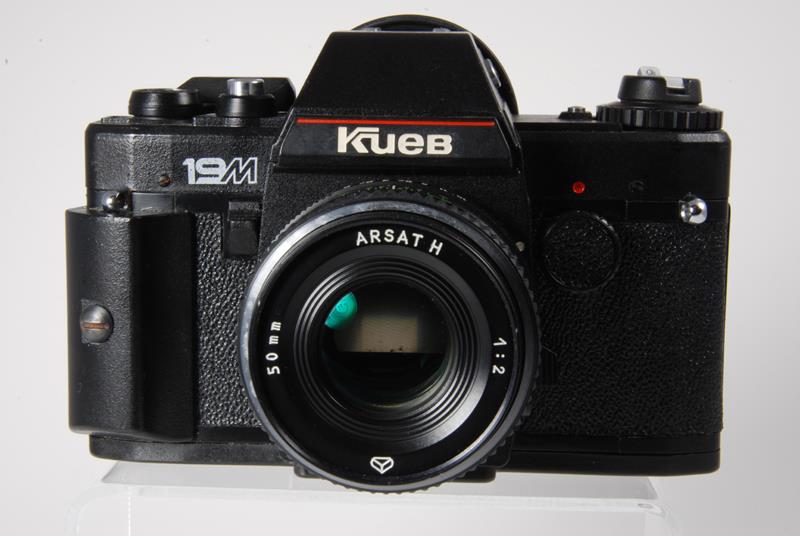The Kiev 19M is a manual-focus manual-exposure single-lens reflex camera made in the Ukraine by Arsenal. It uses the Nikon F mount (AI). The standard kit lens is a 2/50. In contrast to the earlier Kiev 19, it has diaphragm coupling for full aperture metering [2].