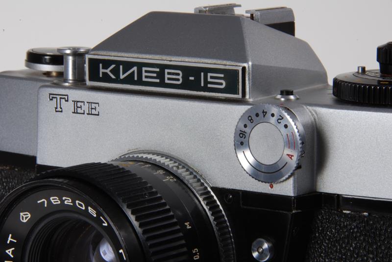 Although functionally the same as the Kiev-10 the Kiev-15 camera has been redesigned. The raised area of the front has the lens mount in the center and "TEE" in the upper right corner. The "TEE" signifies Through The Lens (TTL) metering. The Prism has a name plate with "KIEV-15" engraved in Cyrillic block letters. The shutter is of the same type as the Kiev-10 with no change in speeds.