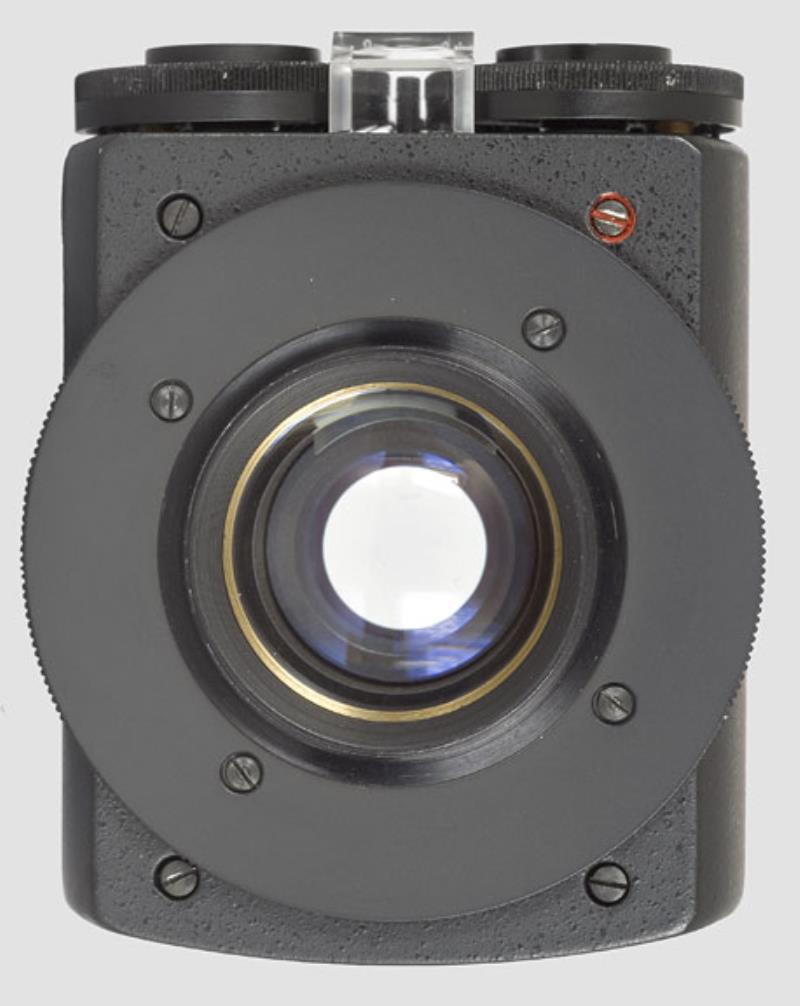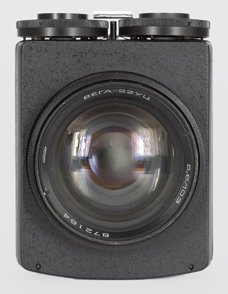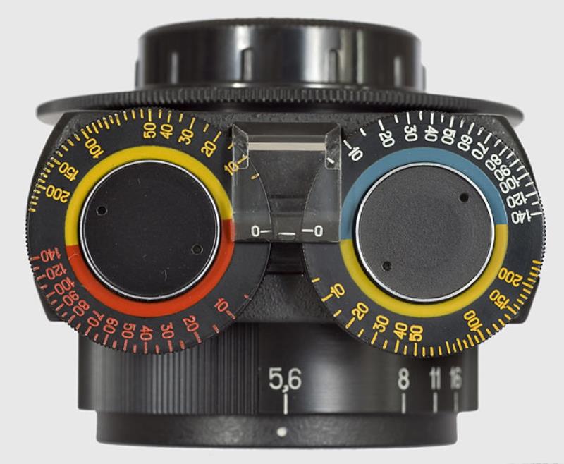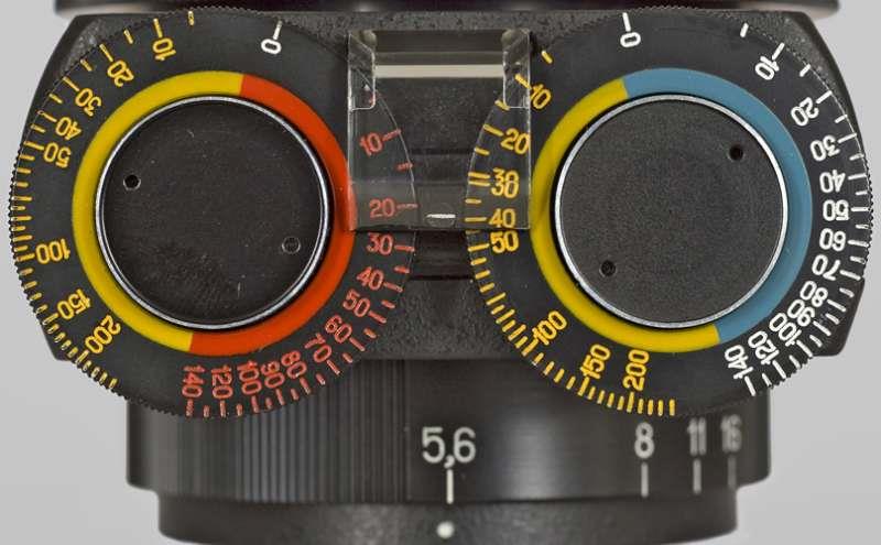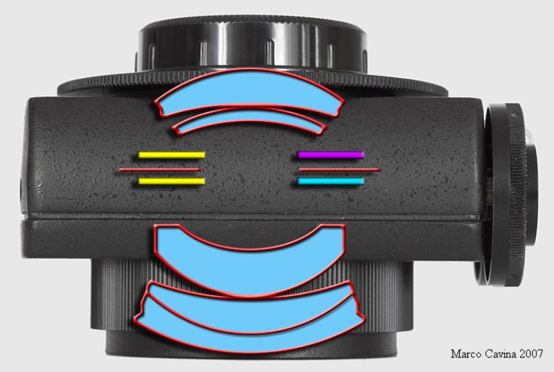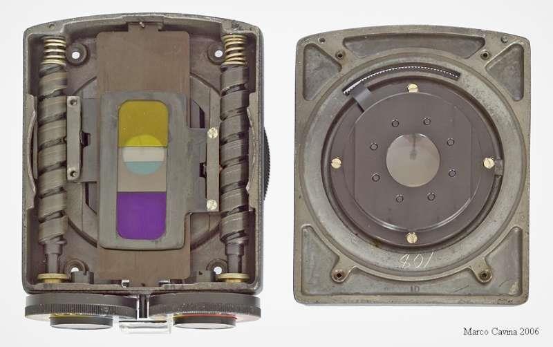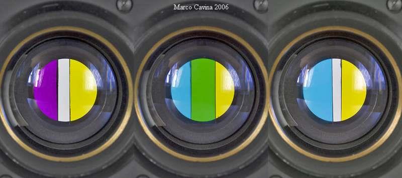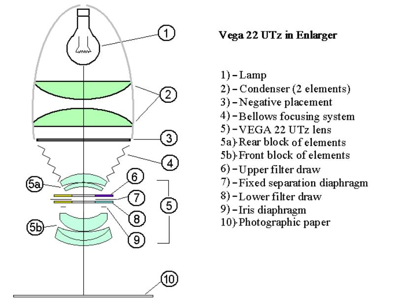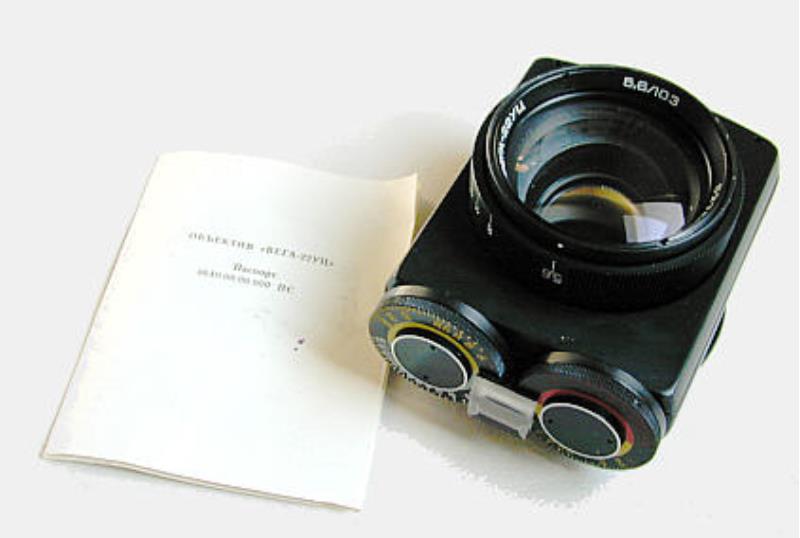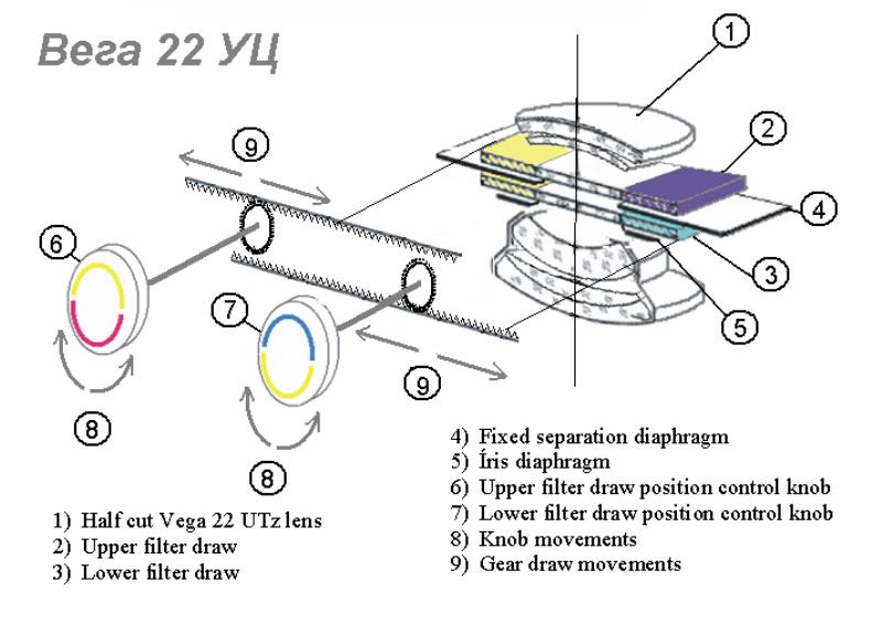 Enlarging lens Vega 22 UTs 5.8/103mm used for enlarging. Coversup to 6x9 format. This lens has four built in filters . You use it wide open. The two controls regulate the amont of needed color (or no color) in order to give a correct color rendering in the paper. The right dial controls the amount of yellow or violet. The right dial the yellow and cyan. So you can obtain Red (violet+yellow); Yellow; Deep Yellow (Yellow + Yellow); Orange (Yellow+violet+yellow); Green and Dark Green (Yelow+Violet); Blue (Violet + Cyan). Cyan and Violet.