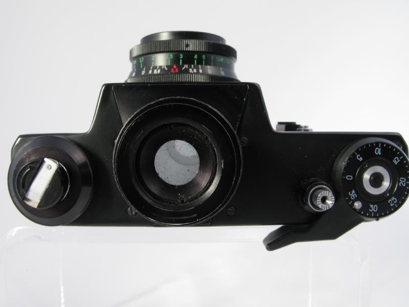 Zenit Labo was produced in the begining of the 1980 years . It was intended for microscope use. It used a Zenit TTL body and some Zenit EM parts and was completly hand built each at a time. Very small production and rare to find. Has no prism. no light meter, no flash synchonizing. no auto diaphagm. Its shutter has only the "B" setting with "soft" mirror lift with cable release and an auxiliary self timer for automatic vibrationless 3 second shutter exposition. Standard M42x1 mount and a 8x focusing loupe in plain ground glass with a center cross. We include four pictures The smaller one was made by KMZ, the three other pictures show a BelOMO production. There are only slight differences: The advance lever typicaly of BelOMO construction (all plastic covered) and two eyelets.