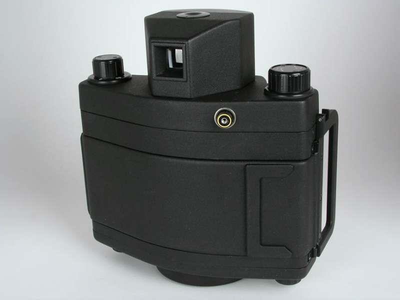 The body is matte black finished aluminum alloy with a high level of finish. There is no rangefinder ... the lens is focused by hand ... 1 meter to infinity. A bubble level is visible in the bottom of the viewfinder. The film plane is perfectly curved to match the rotating lens and produce no distortion in the finished panoramic photograph. Shutter speeds are: 1 sec., 1/2, 1/4, 1/8, 1/30, and 1/60. Comes with four filters as shown. This camera is very large and heavy, weighing 101 oz. (6.31 lbs.) and measuring 8.5" wide x 9" tall x 4.75" deep.