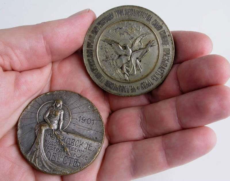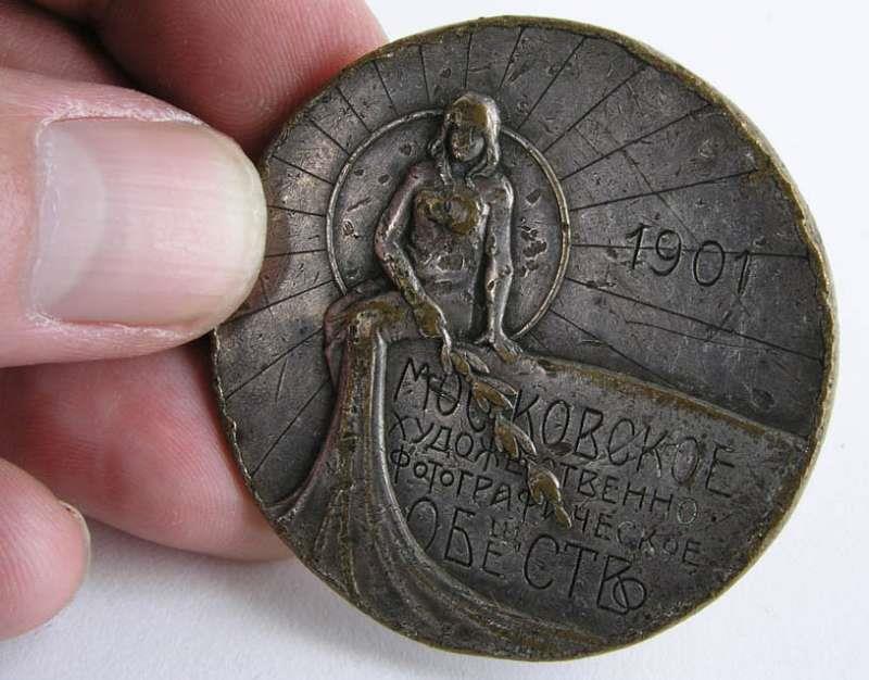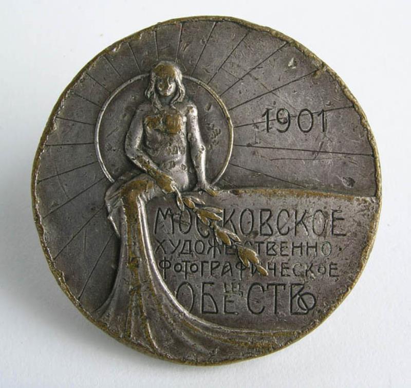 The medallion with the woman pictured is designed in the Art Nouveau taste and commemorates the '1908 Moscow International Photographic Exhibition' held by the 'Moscow Artistic Photographic Society'. The date of 1901 probably refers to the founding of this society. This medal is in poor condition, but rare in any condition, and measures 46mm, weighing about 36 grams.