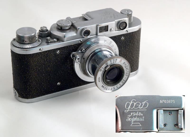 Pictured is a FED-Zorki of 1948. This type originated the Zorki line, and its engraving shows the transition from the FED, made in Kharkov to the Zorki, made at KMZ near Moscow. The old KMZ logo on the camera and on the lens can be seen.