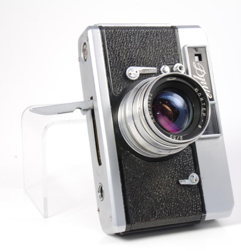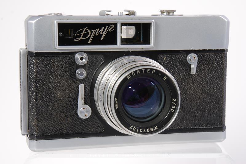 Drug (pronounced as DROOG - A Friend in Russian, sometimes written as Droug also) is one of the rare and exotic Soviet cameras. It is known for its Leicavit type film advance mechanism.