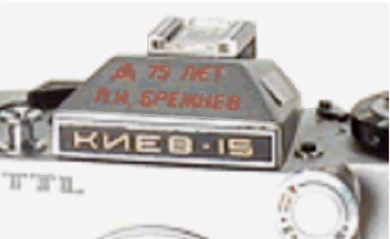 - Kiev-15 TTL Nº. 8003308 "Gift Camera" - Single lens reflex outfit. Kiev 15 TTL camera 24x36 mm, with Mir-1 Avtomat 2,8/37 mm Nº. 8003308, Helios-81 Avtomat 2/53 mm Nr. 8003308, Jupiter-9 Avtomat 2/85 mm Nº. 8003308, Jupiter-11 Avtomat 4/135 mm Nº. 8003308 and 2 color screw filters. All items are attached in a styled plate. Each item has the same serial number, in which are engraved the hammer and sickle and L. I. Brezhnev 75 years (Leonid Ilych Brezhnev 1906-1982, leader of Soviet Union 1964-1982). Origin: According to our sources this outfit was made as a gift to the former USSR head of state for his 75th birthday; Dec. 19th 1981, and was planned to be given to him at his visit to the Arsenal factory in Kiev at the same date (Leonid Ilych Brezhnev was born in Ukraine). The visit never occurred and Brezhnev became sick and died in the following year. The gift was kept at the factory. During the demise of the Soviet regime this outfit disappeared from the Arsenal factory and was further sold in an auction in May 2002 by a Russian collector.