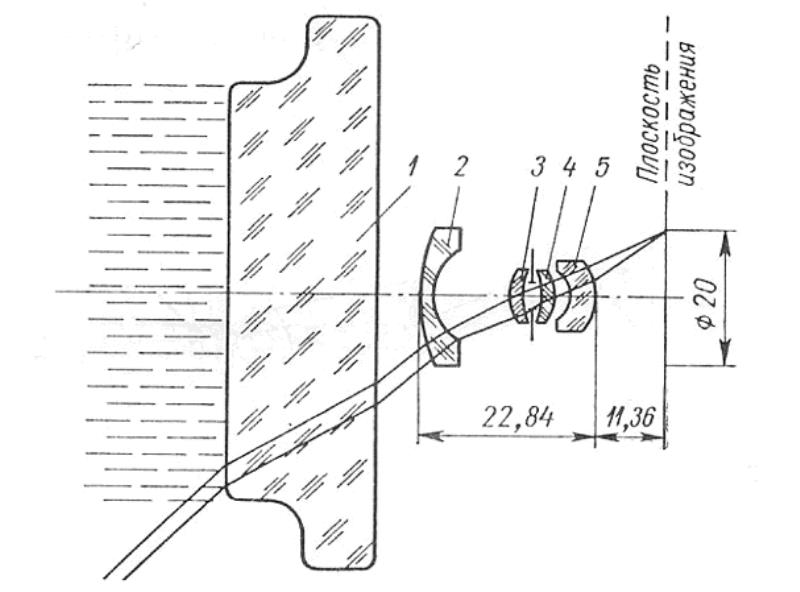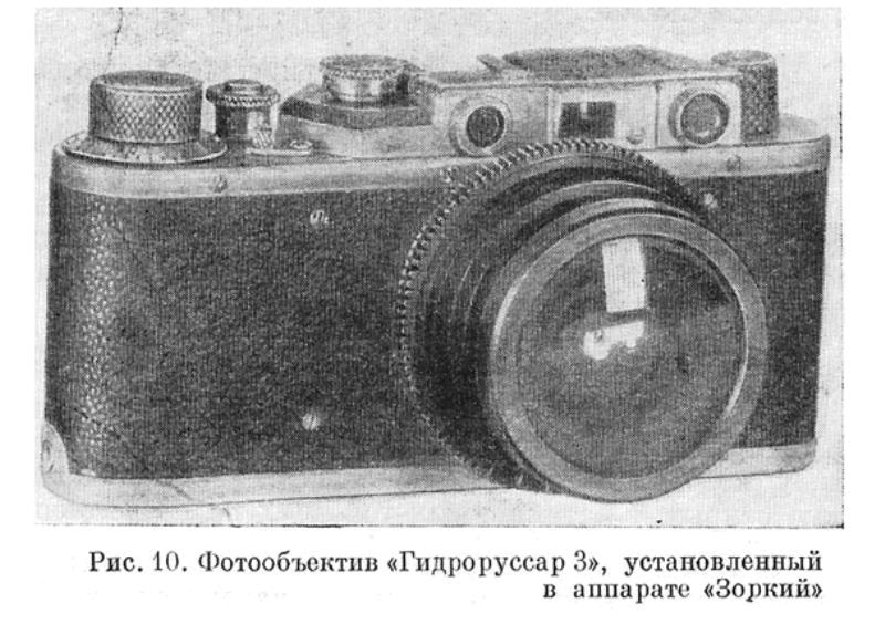 Developed for underwater pictures this lens has 70º underwater field and 120º on the air, a relative aperture 1:10, a focal length of 14,3 mm. Calculated in 1953 by - ЛИТМО (LENINGRAD INSTITUTE OF PRECISION MECHANICSAND OPTICS). " On fig. 67 is shown the scheme of an objective,"Гидроруссар-3". The objective consists of plane-parallel window protective glass 1, the first negative component made as a simple meniscus 2 and the second positive component consisting of two positive meniscuses 3, 4 and a concentric lens 5. By means the meniscuses lenses 3 and 4 there are corrected the astigmatism and coma, and by means of the concentric lenses 5 - the spherical aberration... Residual distortions does not exceed 1,5 % on the edge of the frame, and is noted a chromatism increase of 0,017 mm. Despite of rather simple design, the objective "Гидроруссар-3", possesses high image quality, has small dimensions and is one of the first two-component hydroobjectives " [109, p. 118-119]. " On fig. 10 we see the objective "Гидроруссар-3", mounted in a "Zorki" camera. The focus system is absent in this lens, once depth of field is so great, that allows to make precise photos of objects, since 50 cm to infinity. An external ring controls the diaphragm The external diaphragm ring has engraved (1:4, 1:5,6; 1:8; 1:11) which are really (1:10, 1:16, 1:22, 1:32. 1:44) it is executed with six petals and has a direct tooth with the module of gearing m=1, for external diaphragm control. External diameter of protective glass - 50 mm, and it goes directly in contact with water in special underwater boxes. Source