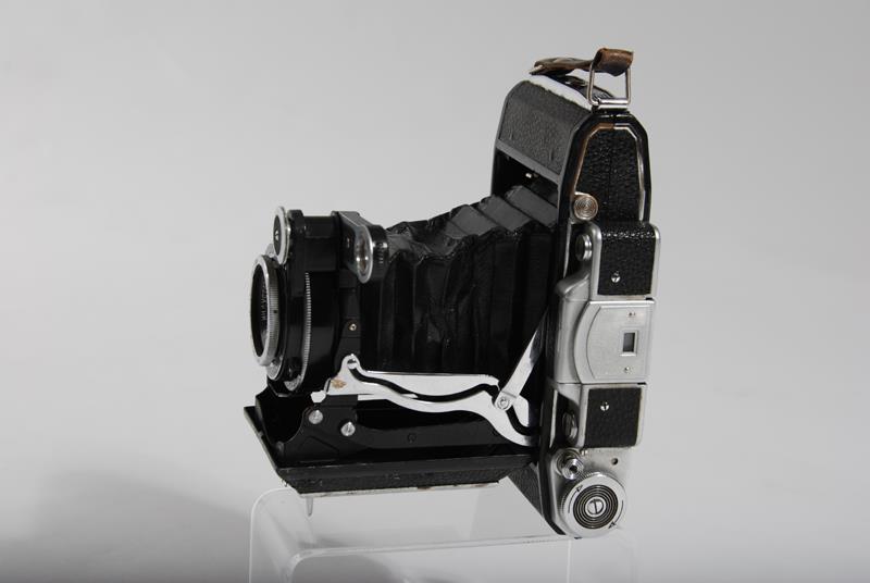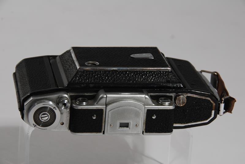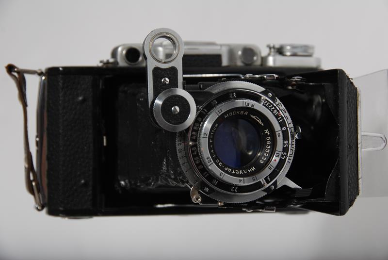 The Moskva-4 is identical to Moskva-2, with a flash receptacle added. There was also a little drop in masking frame provided to convert the camera to 6x6 cm. This camera was produced from 1955 to 1958. The case for this camera is made of brown plastic or leather [2].