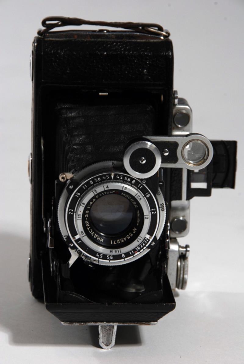 This is the second camera in Moskva group. A range finder with a pop up viewfinder on the shutter assembly was added in this model. This camera was produced from 1947 to 1956. The case for this camera is made of brown plastic or leather [2].