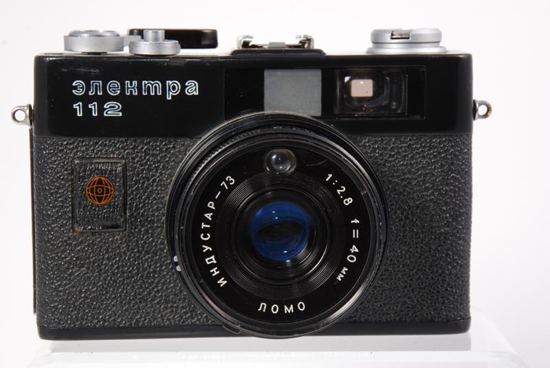 The Electra 112 is an electronic rangefinder combined with viewfinder camera. It has a CDS meter coupled to an electro-magnetic shutter. It features 3 diodes in the viewfinder to control exposure and a hot shoe. It came in chrome and black and all black. There was an olympic model as well as 3 different logos, LOMO, arms of the city of Leningrad and a Hemisphere. What if anything the different logos signify is unknown (source: http://www.commiecameras.com).