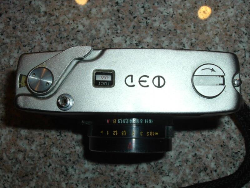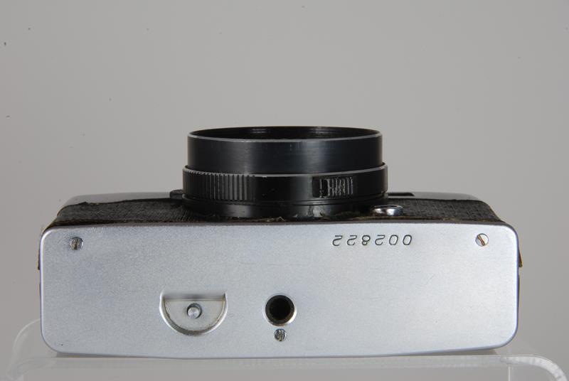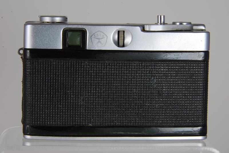 This is a half frame viewfinder camera with manual override. Focusing is by distance scale on the lens or symbols in the viewfinder. Shutter speeds are visible in the viewfinder as is a parallax frame for close-ups. The back is removable and the camera has a jack for flash but no accessory shoe. There is also a very rare version with white fabric and another commerative with a "60 years of the USSR" issued in 1977 and the olympic edition.