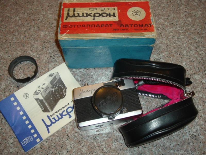 The very first production was different it had rounded corners and a fixed door wrapped around the bottom. Mikron was in script letters on the front with FED on the top. These cameras are very rare and represent a pre-production batch. It has a soft black vinyl zippered case (source: http://www.commiecameras.com).