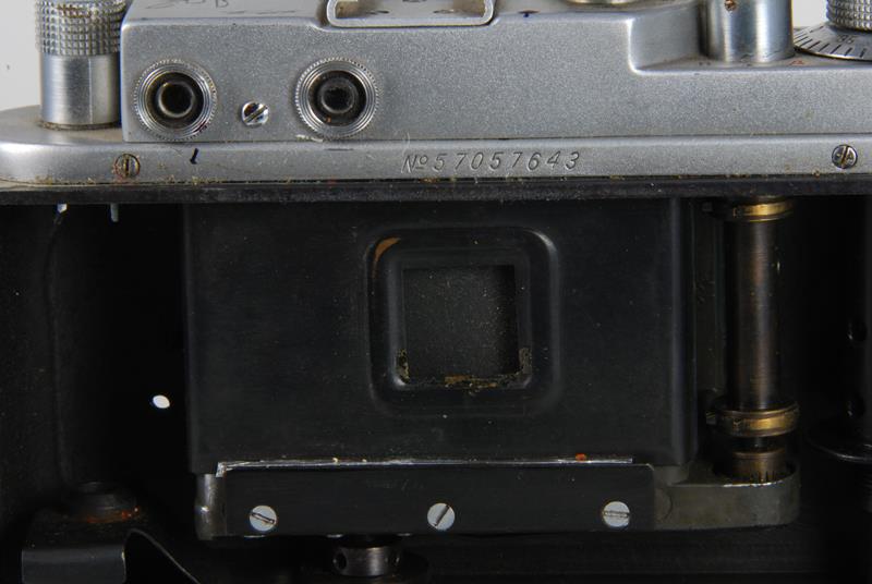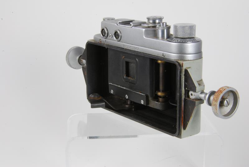 The back plate can be taken off by unscrewing 2 large bolts and swiveling them to the side. The frame mask is very unusual it is 14x14mm. The camera looks like it that it still takes 35mm perforated film but the film advance teeth were ground off except for 2 on top and bottom of it, maybe for the purpose of only advancing it 14mm..