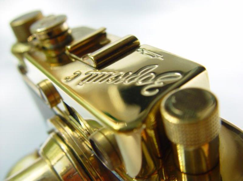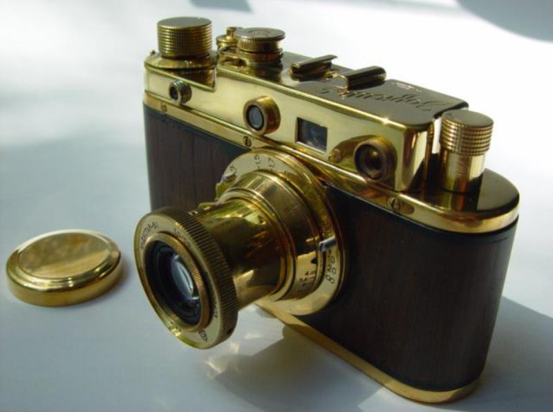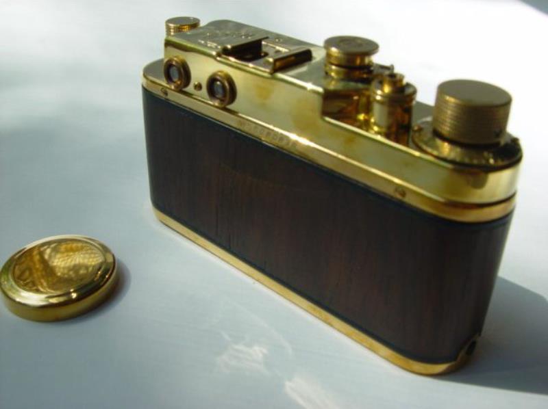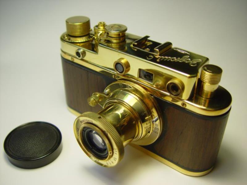This is a beautiful fantasy version of Zorki C manufactured in 2007. It has gold-plated body and lens, and wooden covering.