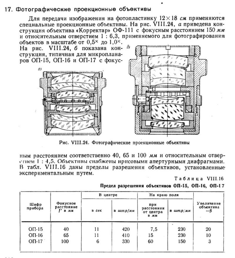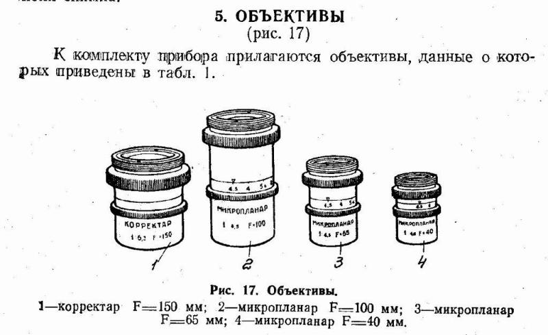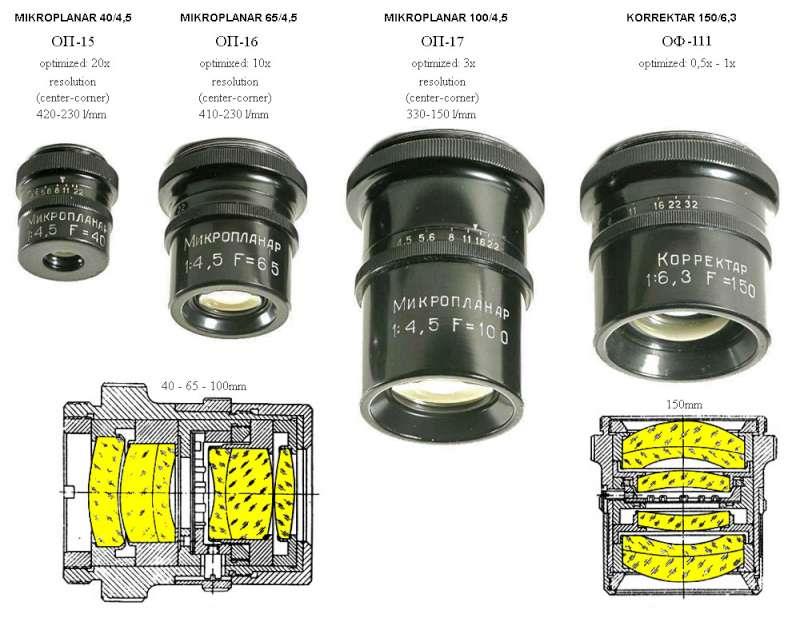 Here are shown three models, of Mikroplanar type. They are done in 40mm f/4,5, 65mm f/4,5 and 100mm f/4,5 focal length. As the name says, they are Double Gauss type much similar to those also built from Zeiss. The Makro-Planar 120mm f/4 version has a resolution around 420-330 l/mm in the center and 230-150 l/mm in the edges. A fourth objective, a 150mm f/6,3, called Korrektar aimed to reproduction in direct scale (optimization in the interval 0,5x - 1x), has his outline much similar to the German Rodenstock Apo-Gerogon. These lenses can be used in various cameras and have capabilities of covering up to the 5x7" image format.