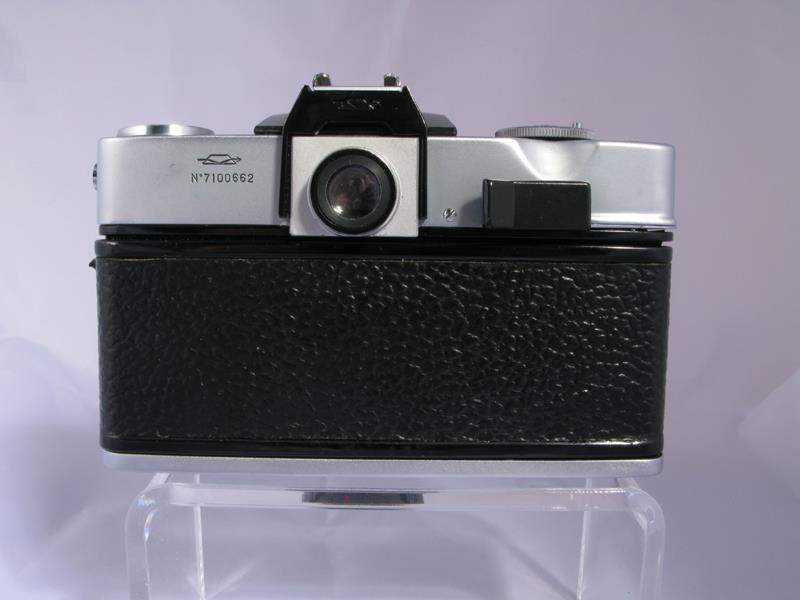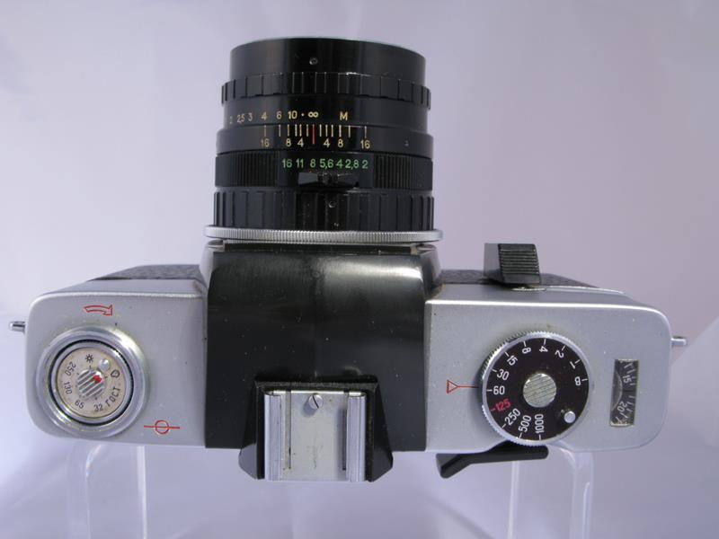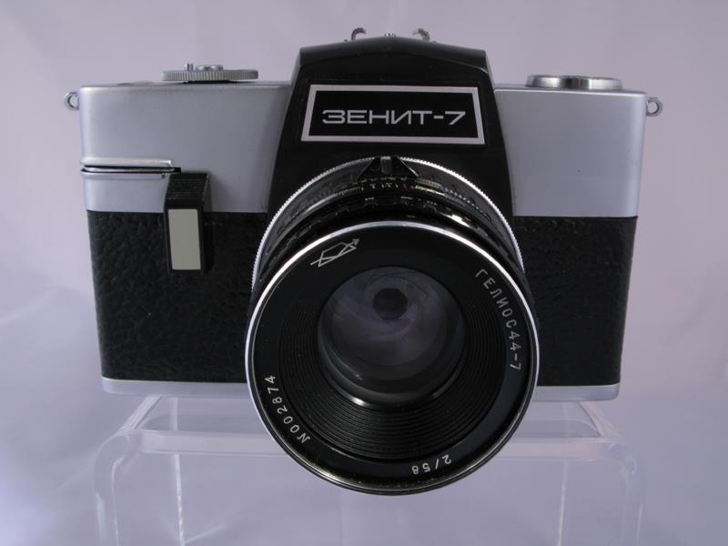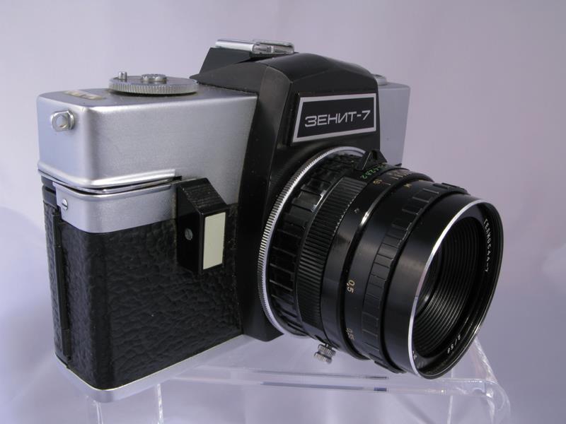 The Zenit-7 is a totally new design having little or nothing in common with previous designs. The Zenit-7 looks like a cross the large electronic Range finder cameras of the early 1970s and a Single Lens Reflex. Part of the cameras strange look is the black rounded prism and lens mount. The shutter release is a large black button with a gray plate on the front. It has a cable release socket on the bottom. On the left top of the camera is a collapsible rewind knob with a film reminder on top. There is a rectangular window for the film counter and the shutter speed dial on the right. The shutter is a horizontally traveling focal plane shutter with a high flash synchronization speed of 125. There are shoulder strap lugs on the sides of the camera and a the flash jack is on the left end. The rear of the camera has the serial number engraved below the KMZ symbol to the left of the viewfinder. The viewfinder takes a removable accessory shoe. On the right side is the black plastic covered wind knob. The bottom has a quarter inch tripod bushing and the rewind button (source: http://www.commiecameras.com). Lens mount is unique to Zenit-7: it is a bayonet with fastening ring like old Canon-SLRs, but on Zenit the fastening ring is on camera side. The lens has a Nikon-like coupling ("rabbits ears") at 5,6 on aperture ring to facilitate full aperture metering, but the 7 has no metering at all. Aperture stop down is like in M42-mount, but on lens side is a lever instead of pin. And the most oddest thing is that the lens is actually with M42-thread, but has an unscrewable adapter on it!