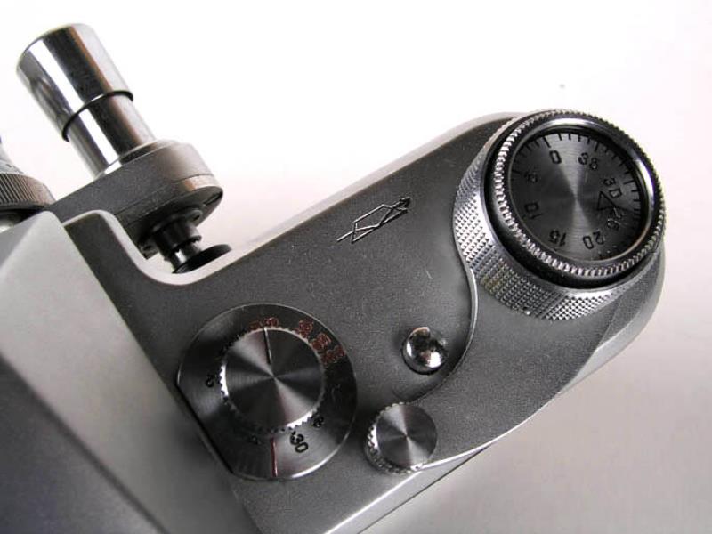 This example from 1959 is an early version with enlarged control knobs that have plexiglass caps (over the frame counter and rewind knob).