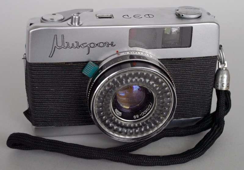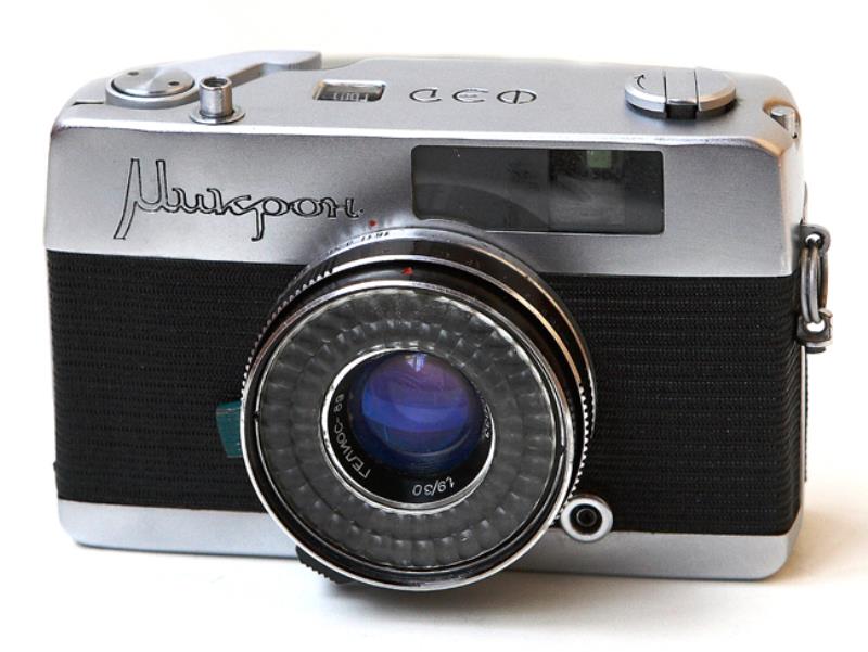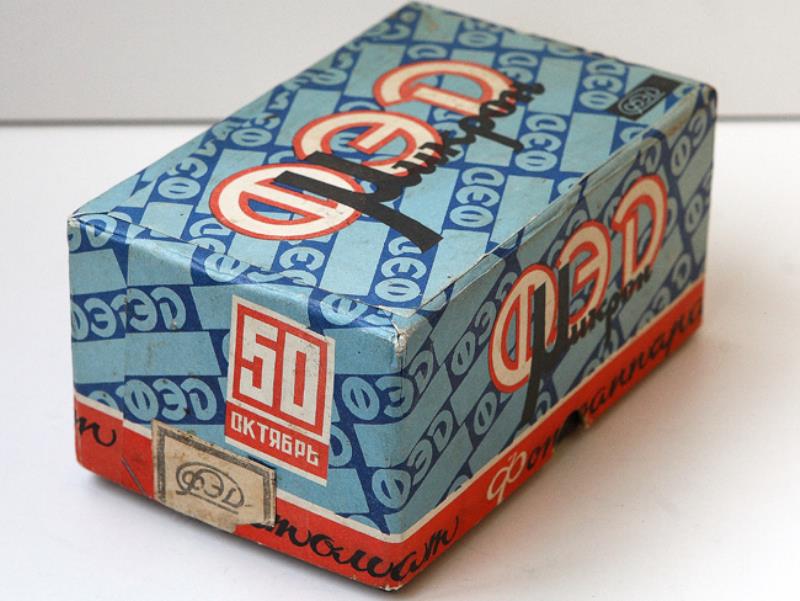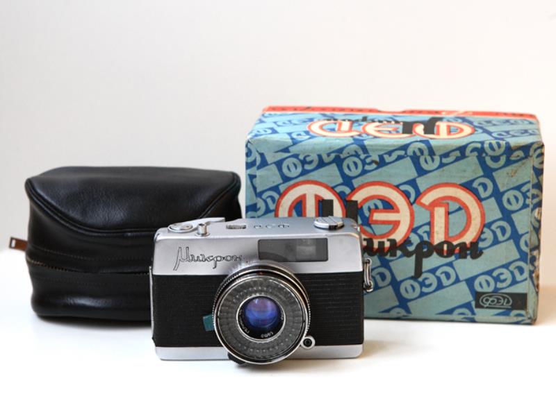 Fed Mikron Preseries camera has the rounded corners and a fixed door wrapped around the bottom. "Mikron" is engraved in script letters on the front with FED on the top.