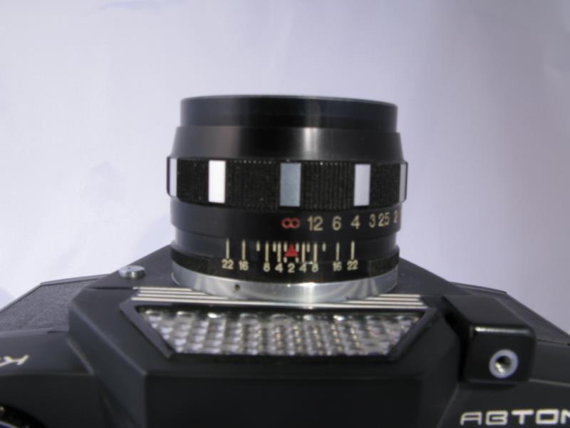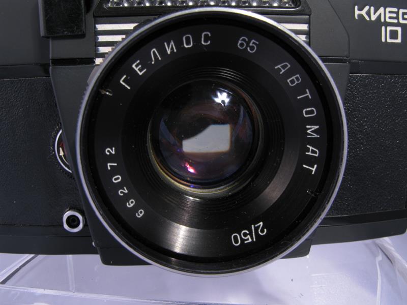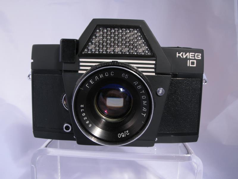 This is an early version of Kiev 10 camera with logo on the front of the body and Helious-65 2/50 Lens. Unfortunately the camera is painted black so until a regular unpainted example is avalaible we will have to do with this one.