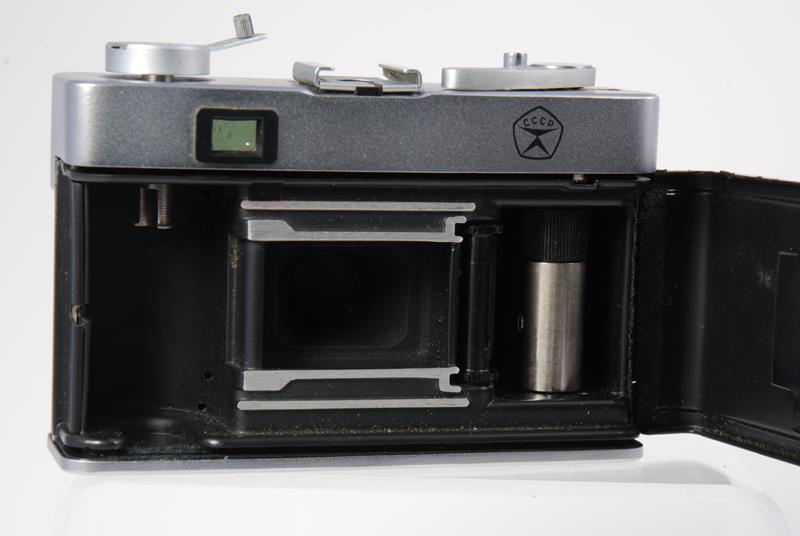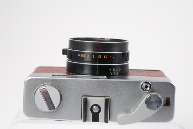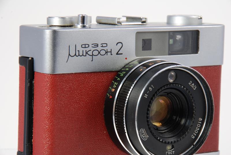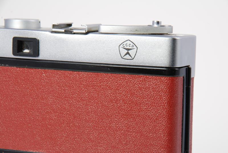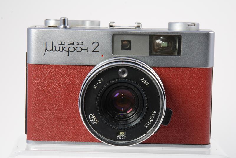 This is a rangefinder camera based on the micron body. The view finder has parallax correction lines and displays shutter speeds and apertures. The camera is full frame and has a hinged back. The meter requires batteries. (source: http://www.commiecameras.com/sov/electroniccameras/index.htm).