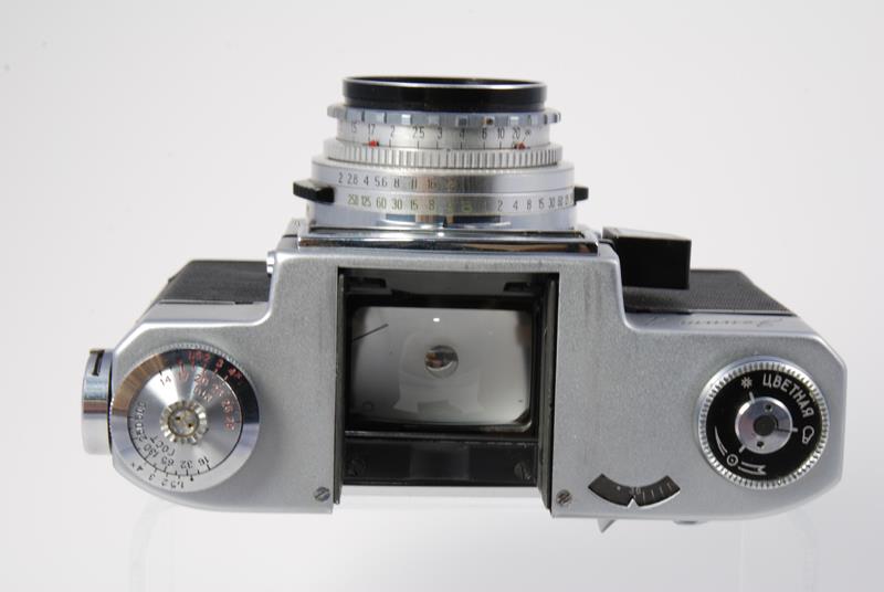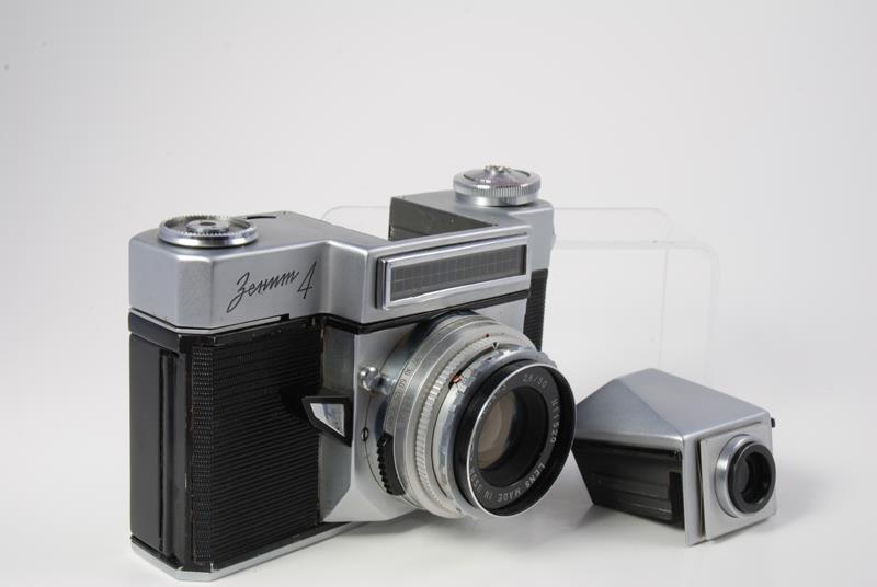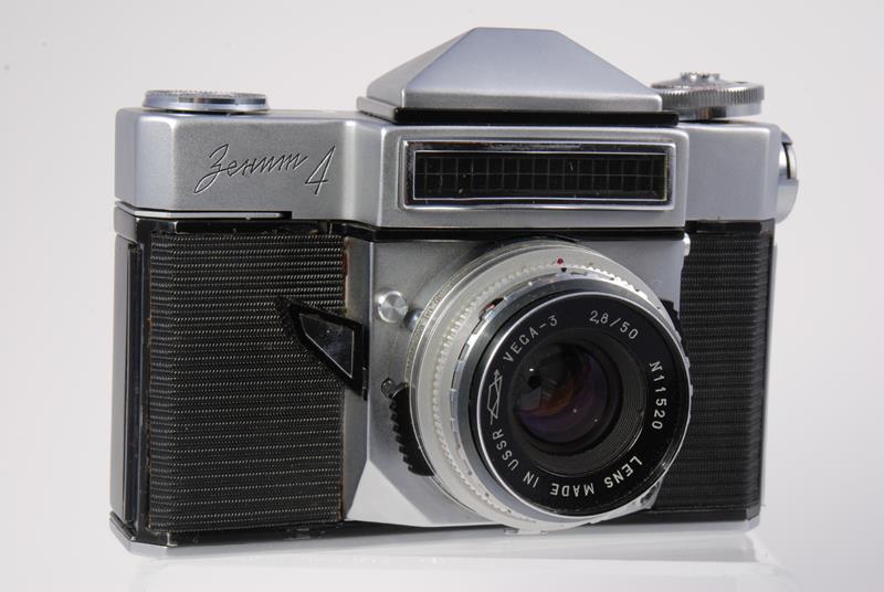 The Zenit-4 ,Zenit-5 and Zenit-6 are all variations of a totally new design, having little or nothing in common with previous designs. The Zenit-4 is a leaf shutter Single Lens Reflex with a built in light meter and interchangeable prism. The Zenit-4 can be operated manually or in a semiautomatic manner. The Speeds and f stops are mechanically interlocked so that changing one automatically changes the other. The camera is covered with black nylon fabric. All controls on the front of the camera are on the lens mount. Lens mount is the same as the Voigtlander Bessamatic and all lenses are interchangeable. Engraved on the upper right of the camera is "ZENIT-4" in Cyrillic script or English block letters. Centered over the lens is the selenium photocell (source: http://www.commiecameras.com).