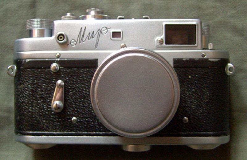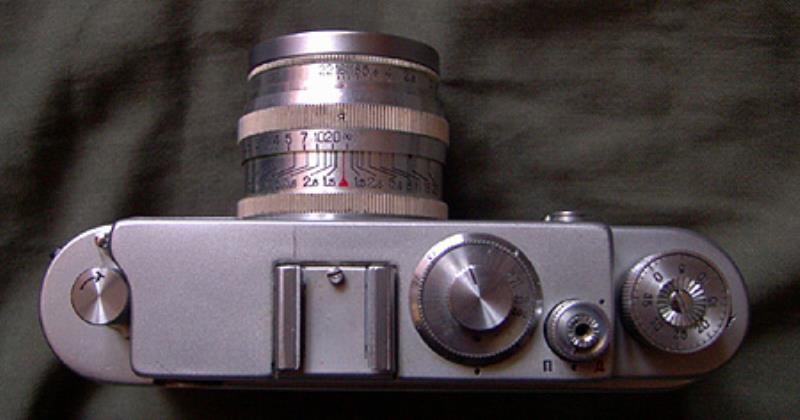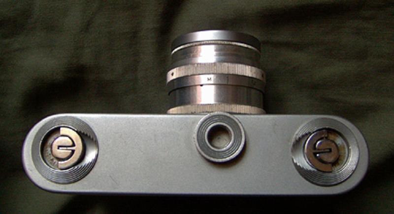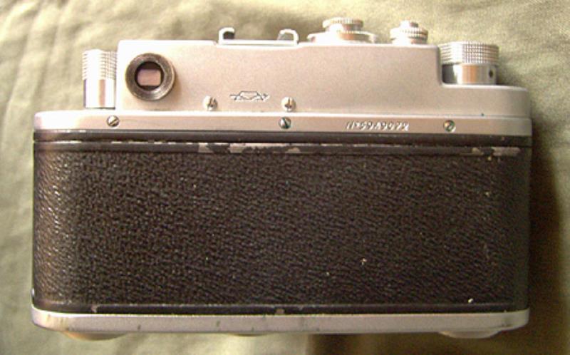 This early model has the same raised rim around the viewfinder and rangefinder windows as the early Zorki 4a. The lens is Jupiter 8 and the camera has the shutter speed 1/1000, although its not printed on the speed scale, it just has a dot. Speed numbers are stamped, not painted