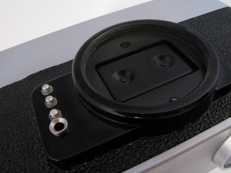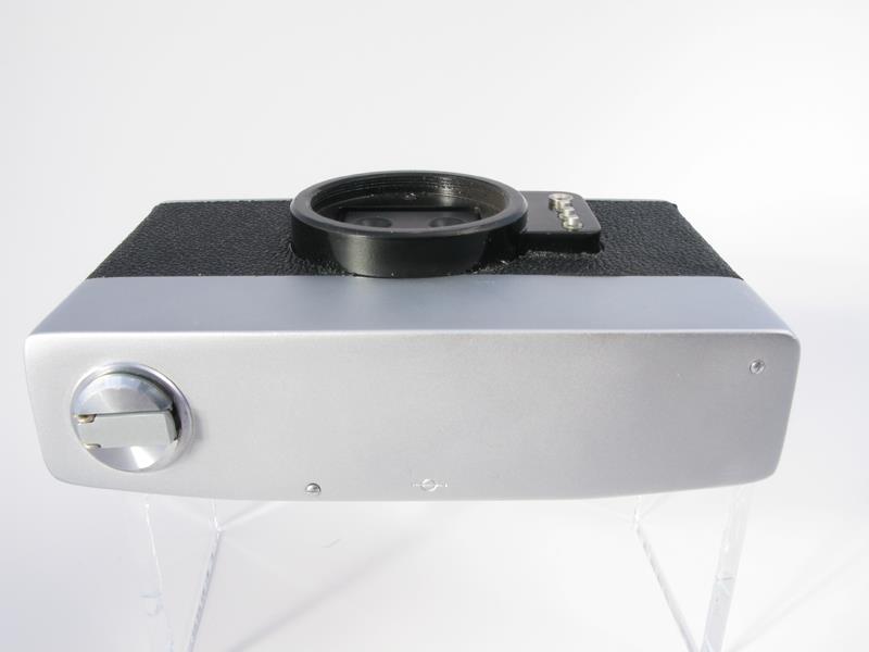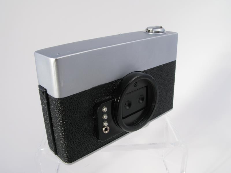 The camera has no viewfinder, shutter or tripod bush. There is a flap that operates mechanically to exclude light to the film plane. A 12 volt power source advances the film by one whole frame and then a partial frame alternately. There is a film speed reminder disk on the base of the camera, but no metering device.