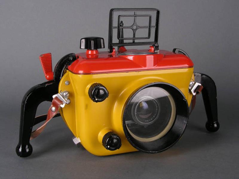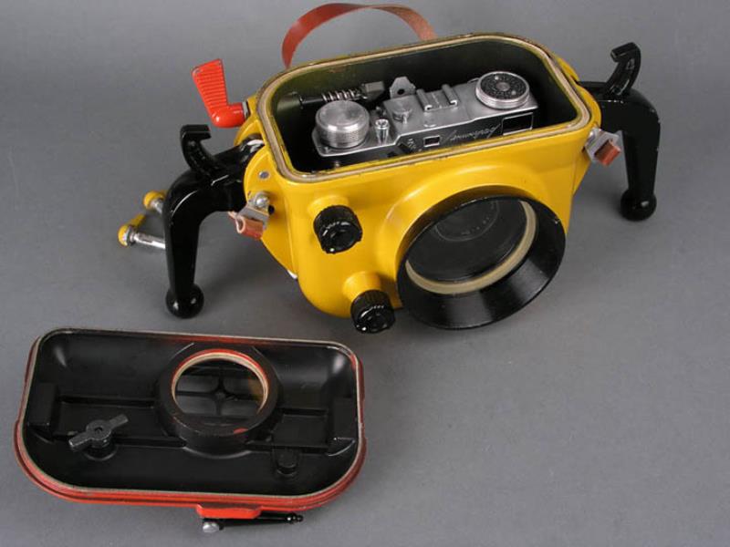 This unit is a fully waterproof molded and painted aluminum housing for use with the GOMZ Leningrad 35mm camera. factory : LOMO / Leningrad, USSR ....... year: circa 1960 / limited production notes : This unit is beautifully made and finished. It comes with many attachments that are affixed to the camera and then fitted into the body of the "KRAB" so that all of the functions of the camera work, including focusing, aperture adjustment, winding the automatic spring-motor / shutter-cocking mechanism, and of course, tripping the shutter release. It has a folding viewfinder on the top with wide-angle and normal lens framing.
